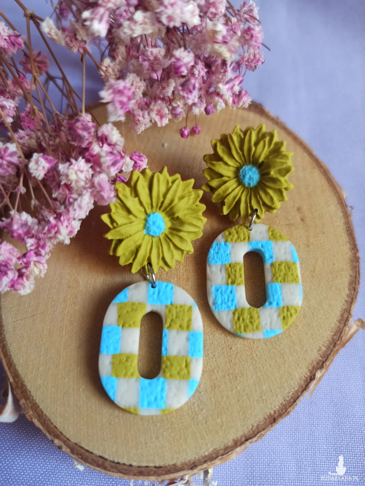 Kolczyki w kształcie oliwkowych kwiatów i owali w kolorową kratkę. Oliwkowy błękitny i ecru.