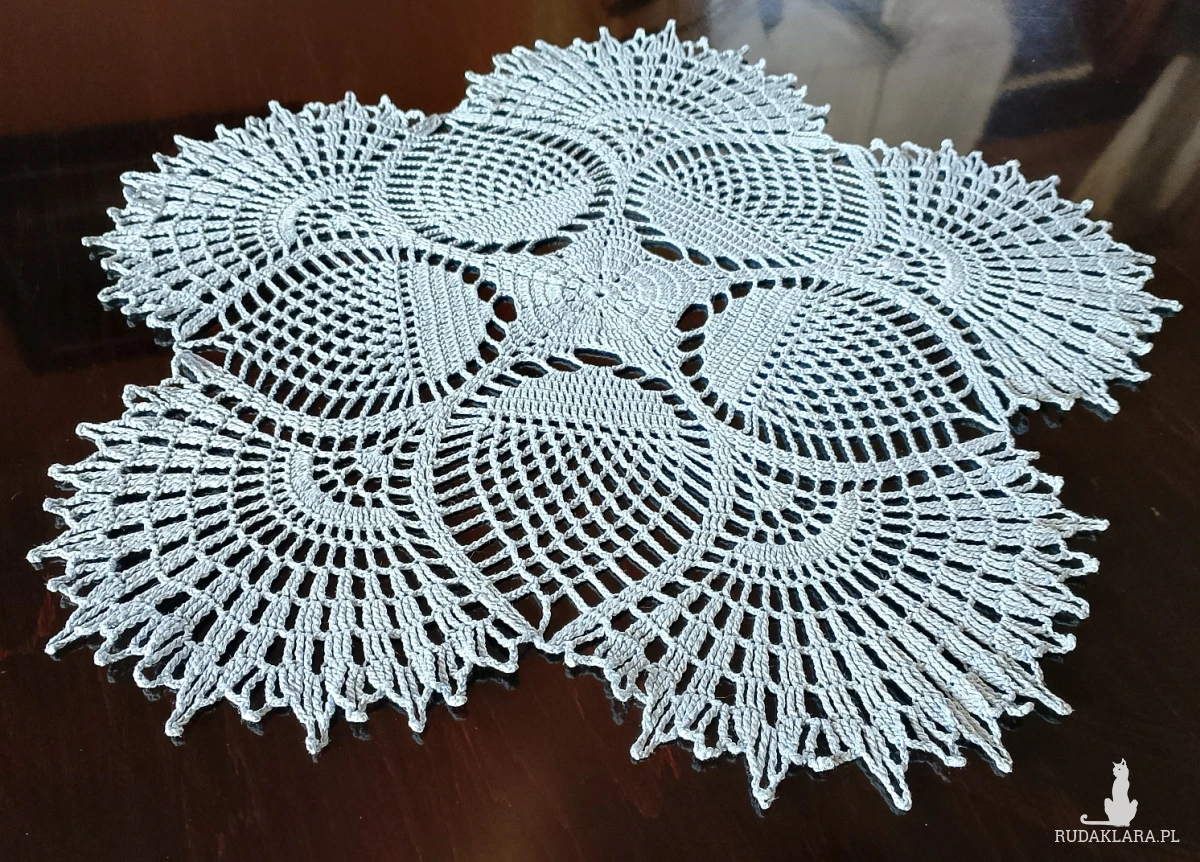 Bardzo dekoracyjna serwetka, o pięknym wzorze, wykonana w całości ręcznie z kordonka w kolorze jasno niebieskim.