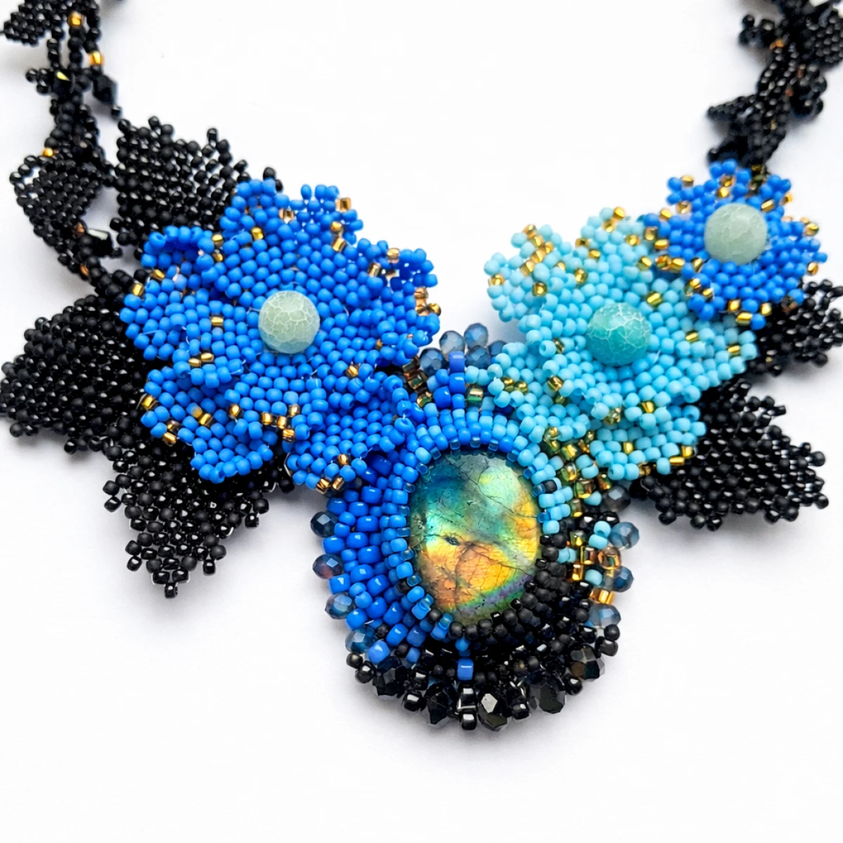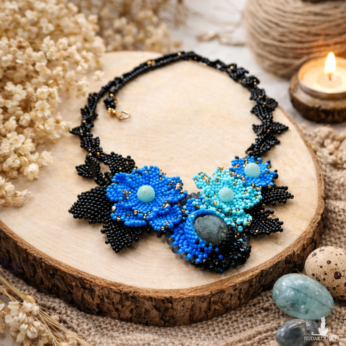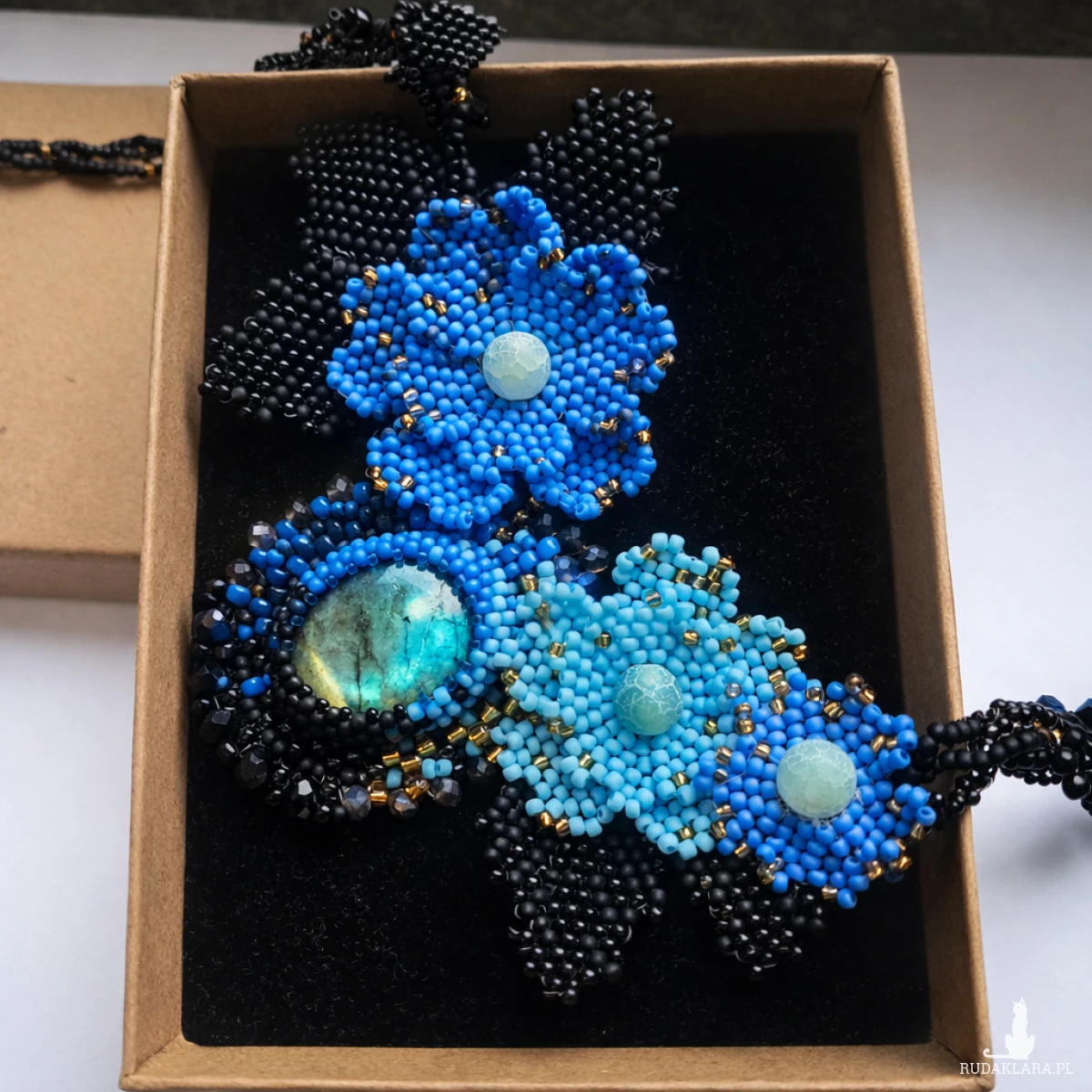 Unikatowy naszyjnik z naturalnym labradorytem i agatami, wykonany ręcznie w technice haftu koralikowego. Szlachetne połączenie głębokiej czerni i królewskiego błękitu tworzy biżuterię klasy premium – dla kobiet, które wybierają wyjątkowość zamiast masowej produkcji.