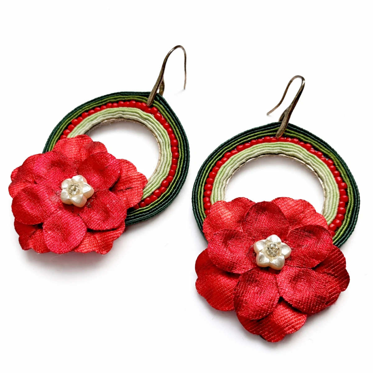 Wyjątkowe, ręcznie wykonane kolczyki sutasz w intensywnym czerwonym kolorze z dekoracyjnym kwiatem. Połączenie zielonych i kremowych splotów z czerwonymi koralikami tworzy efektowną, artystyczną kompozycję inspirowaną stylem etno i folk.