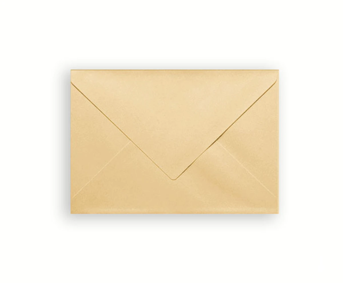 Ozdobne koperty C6 (11,4 x 16,2 cm). Koperty są złote. Eleganckie koperty do zaproszeń ślubnych, na chrzest, roczek, komunię, rocznicę ślubu, na 18-stkę, do podziękowań dla gości lub kartek okolicznościowych.