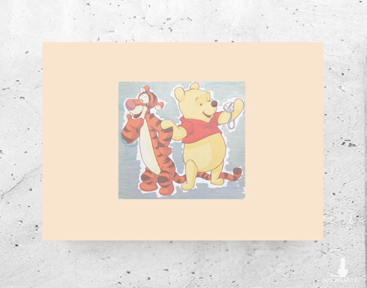 Nowy, kolorowy obrazek z Kubusiem Puchatkiem i Tygryskiem, lekko srebrzyste tło. Grafika na kremowym kartoniku w rozmiarze A4.. Dekoracja na ścianę do dziecięcego pokoju, kuchni, jadalni, sypialni, żłobka, przedszkola, bawialni, klubu malucha itp. Plakat wystarczy dać do ramki w rozmiarze 21 x 30 cm..
