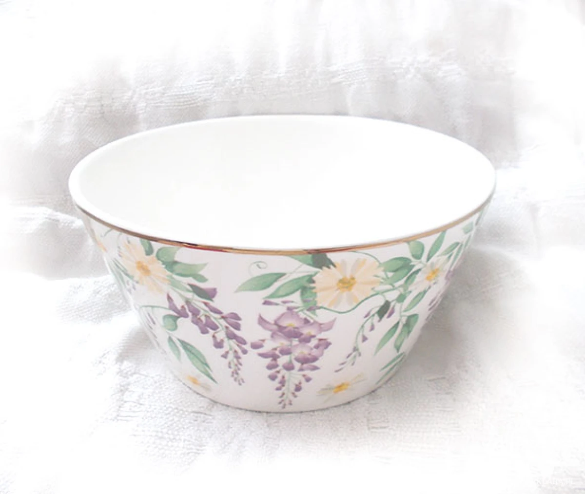 Nowa, porcelanowa miseczka lub salaterka ze wzorem w kwiatki i obwódką w złotym kolorze. Nie nadaje się do zmywarek ani mikrofalówek, marka "Smukee". Wymiary: Szerokość 14 cm, wysokość 7 cm. Oryginalne naczynie zarówno na co dzień, jak i od święta.