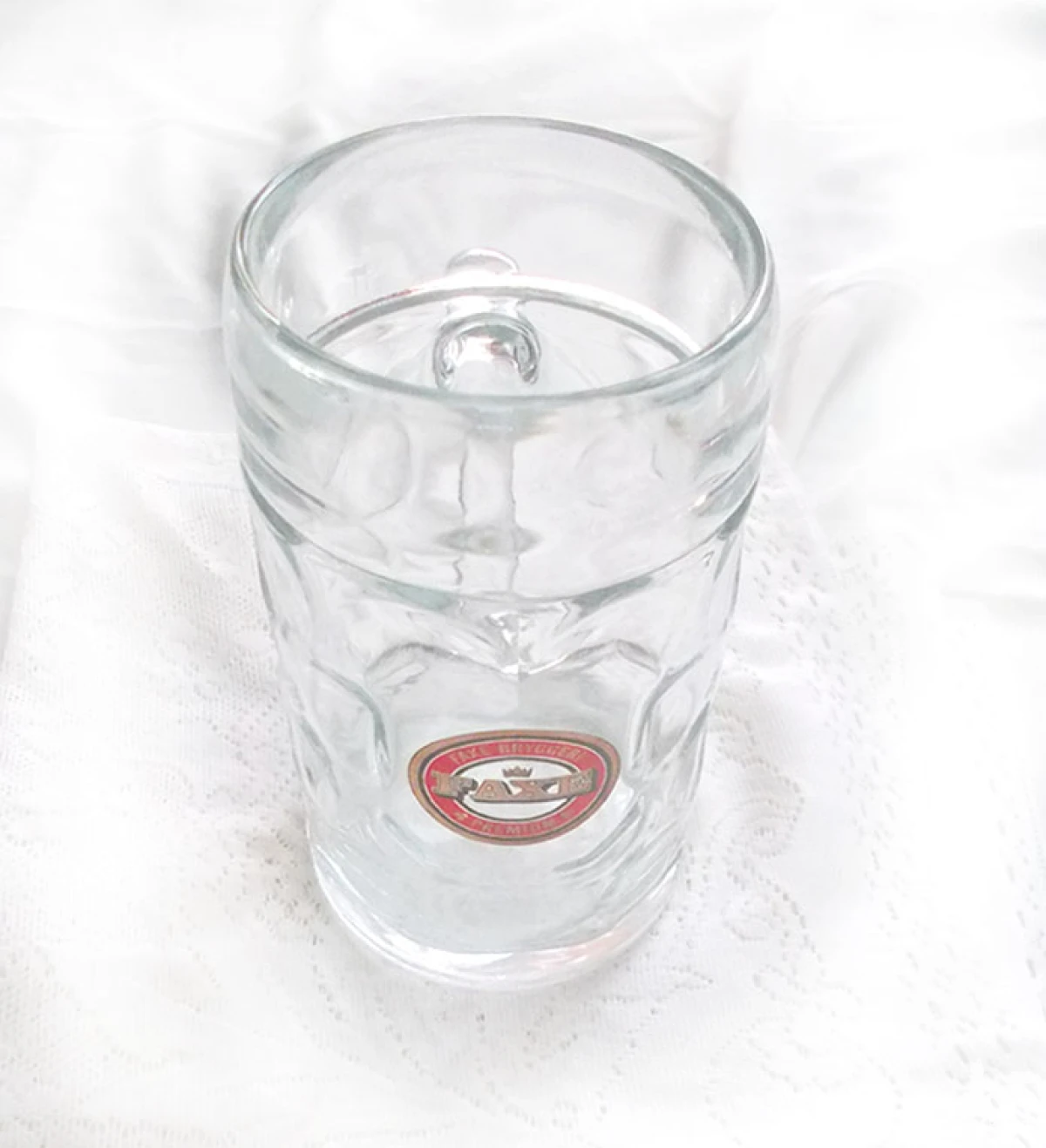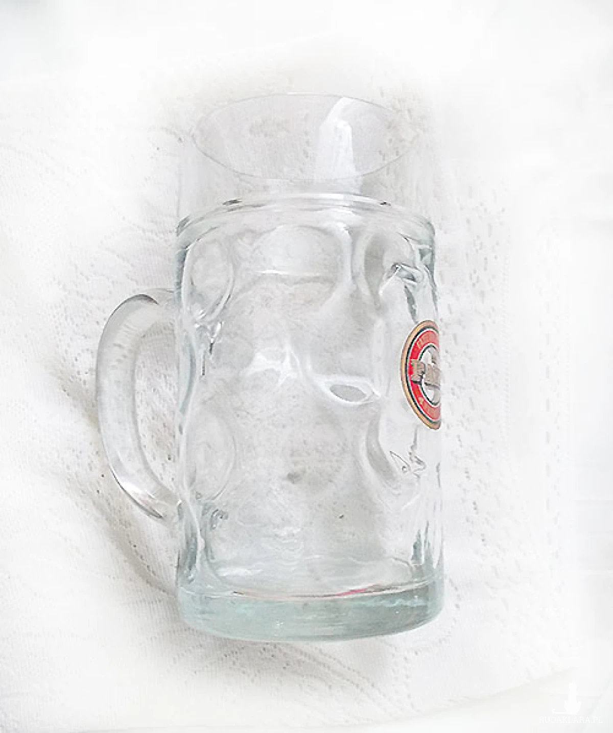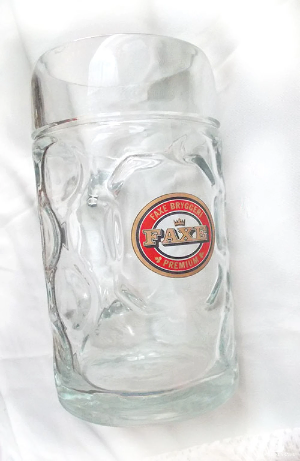 Przedmiot vintage. Duży, szklany ufel do piwa "Faxe". Kufel z grubego, przezroczystego szkła, posiada uchwyt oraz ozdobne tłoczenia. Stan bdb. Wymiary: wysokość 20 cm, średnica 10 cm, szerokość z uchem 16 cm.