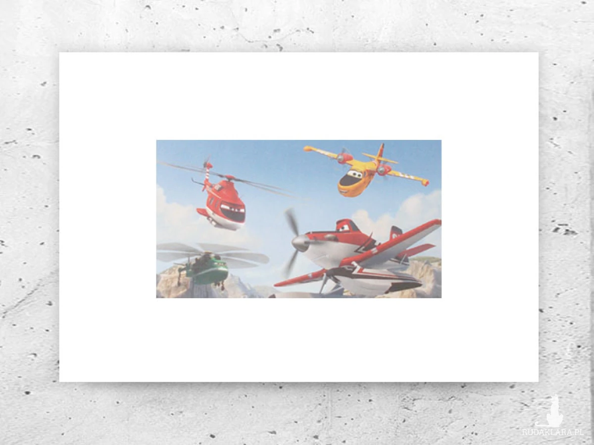 Nowy plakat z animowanej bajki "Samoloty".  Kolorowy obrazek na białym kartoniku A4. Dekoracja na ścianę do dziecięcego pokoju, kuchni, jadalni, żłobka, przedszkola, bawialni, klubu malucha itp. Poster wystarczy dać do ramki w rozmiarze 21 x 30 cm..