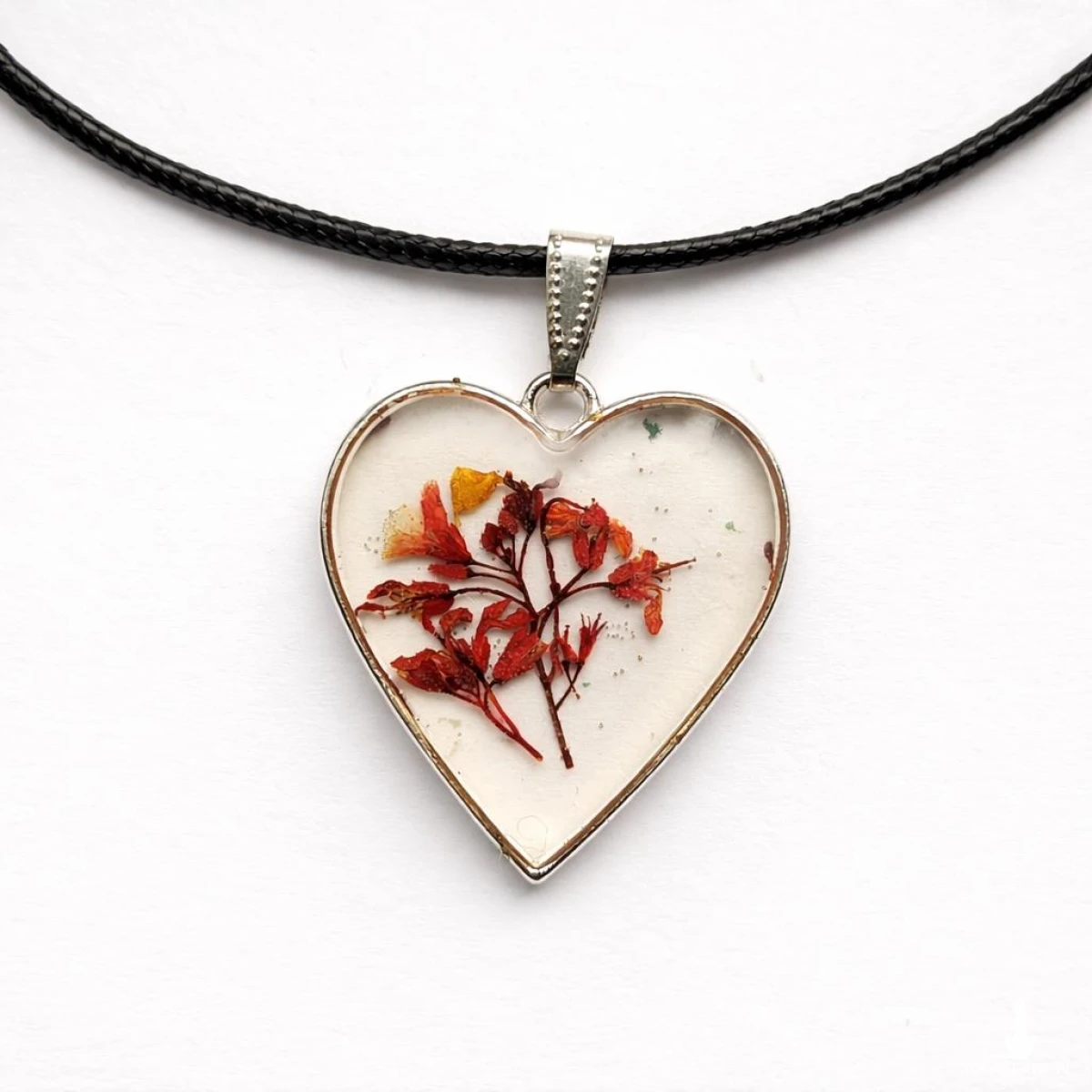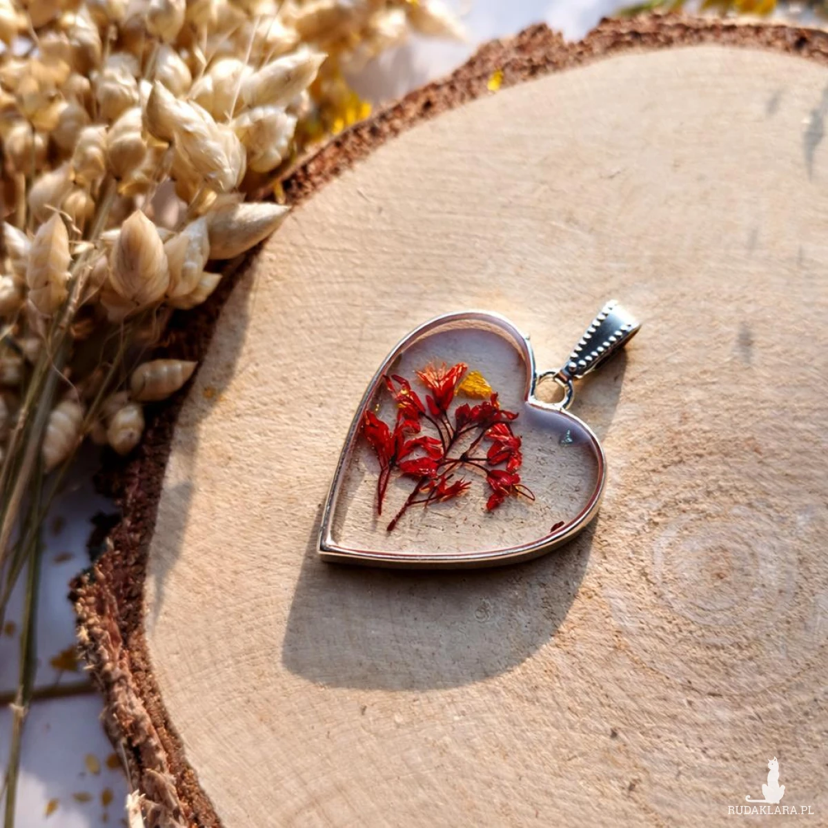 Subtelny i wyjątkowy wisior z żywicy w kształcie serca, wykonany ręcznie z naturalnych czerwonych kwiatów smagliczki zatopionych w krystalicznej żywicy. Srebrna oprawa podkreśla delikatność kompozycji i dodaje elegancji.
