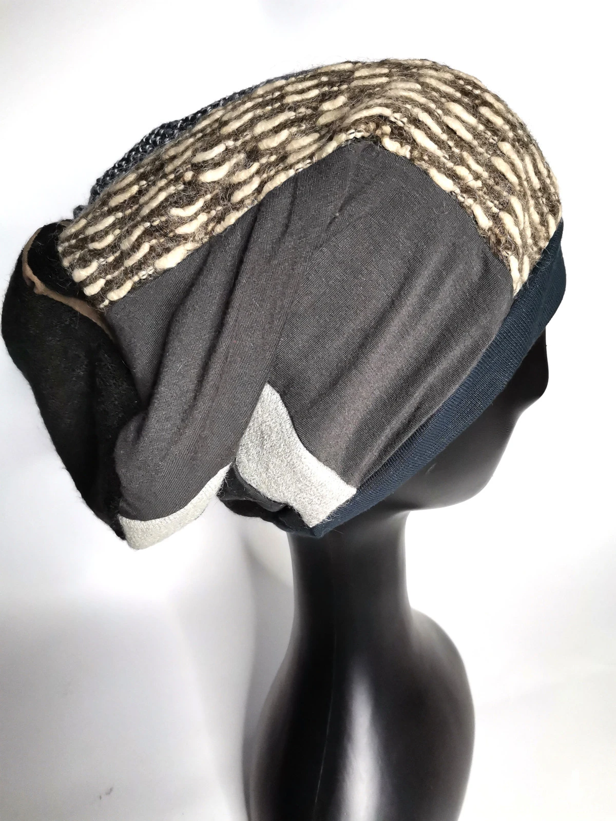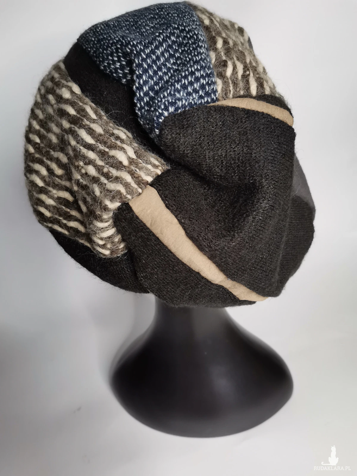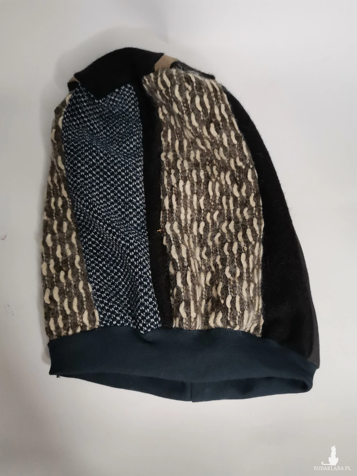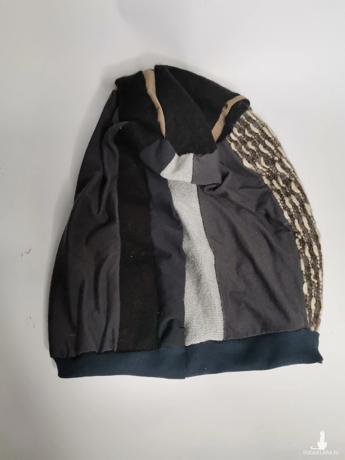 Czapka smerfetka patchworkowa bardzo energetyczna i  miła, rozmiar uniwersalny, dobra na codzienne noszenie,długa, środek zawija się do wewnątrz wtedy tworzy się taki turbanowy kszttal box a1
