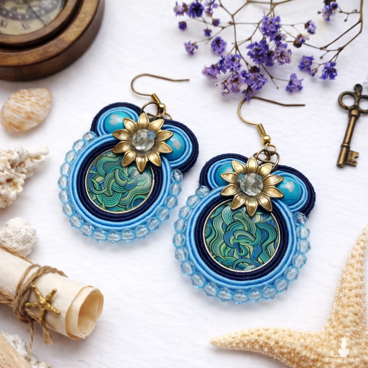 Średniej wielkości ręcznie wykonane kolczyki sutasz w odcieniach niebieskiego z centralnym kaboszonem o melanzowym wzorze. Lekkie i efektowne, idealne jako dodatek do stylizacji boho i etno.