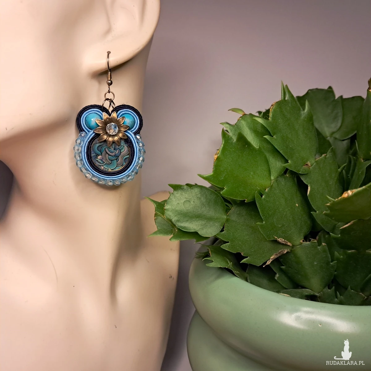 Wyjątkowe kolczyki artystyczne wykonane ręcznie techniką haftu soutache (sutasz). Centralnym elementem kompozycji jest efektowny kaboszon o melanzowym wzorze, który pięknie odbija światło i nadaje kolczykom głębi oraz elegancji.
