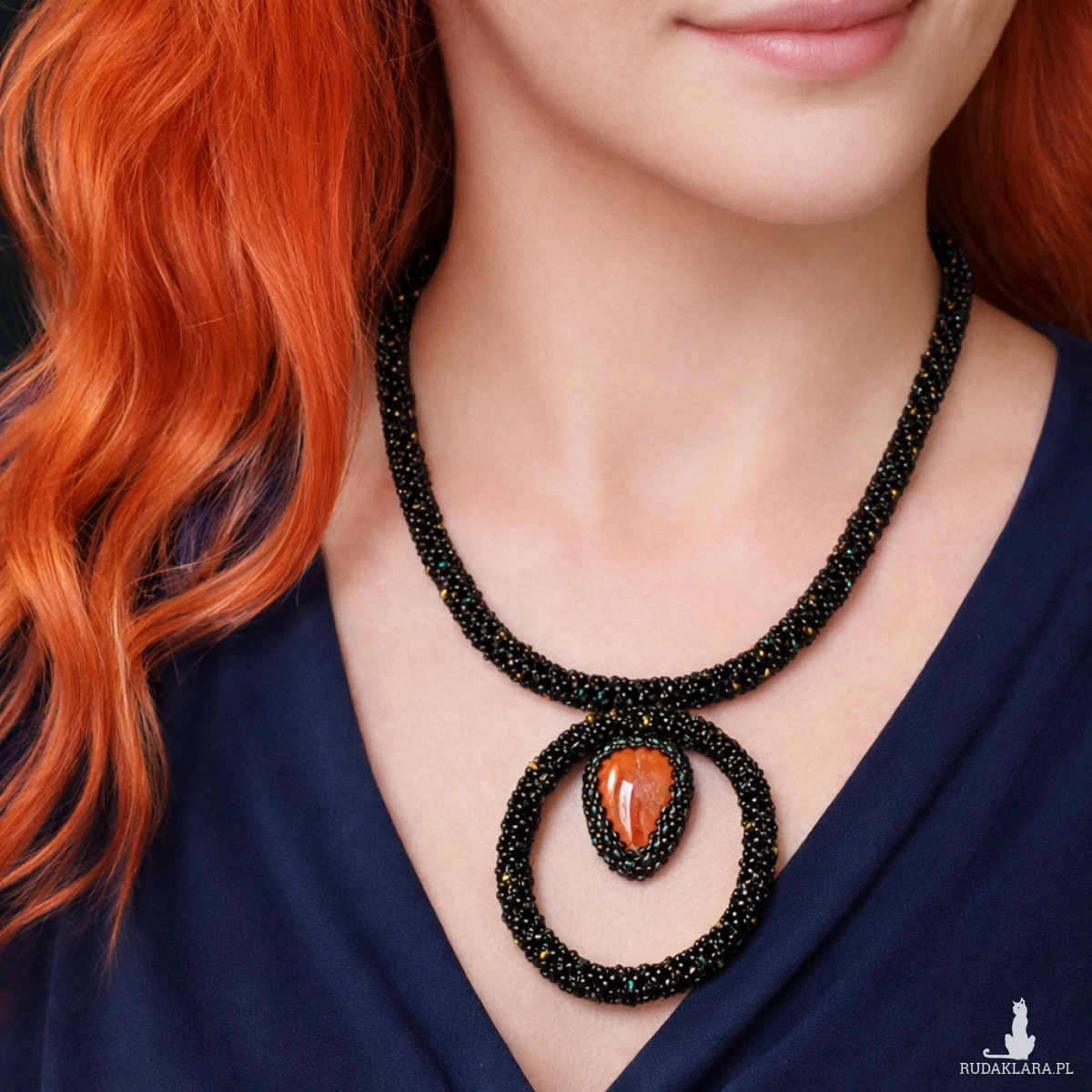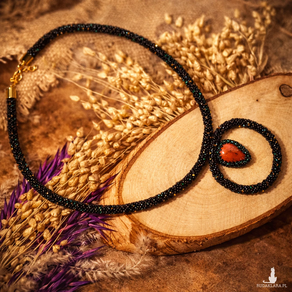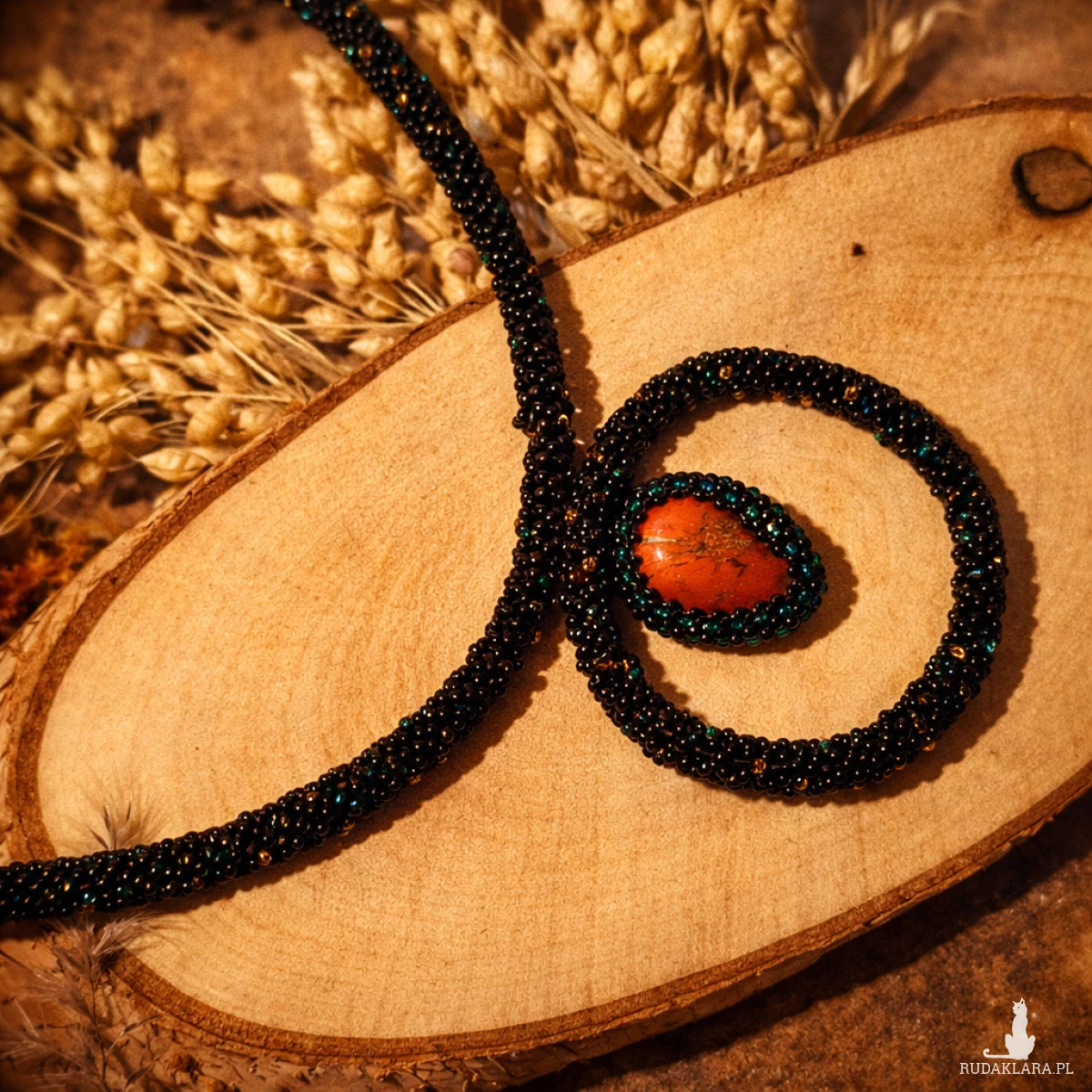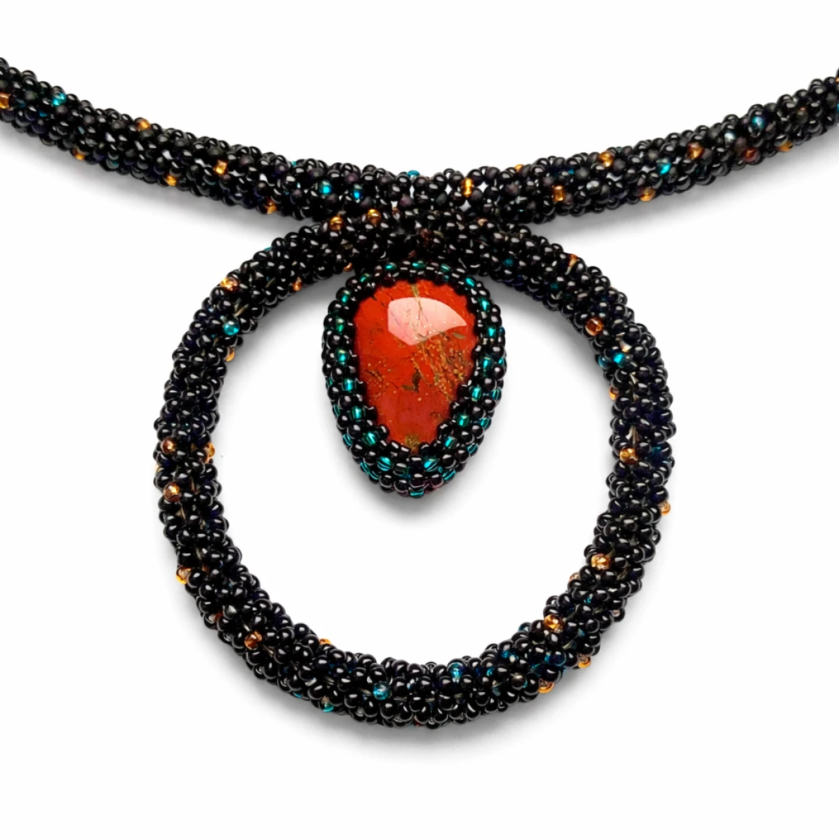 Unikatowy naszyjnik handmade z czerwonym jaspisem, ręcznie obszyty tysiącami koralików. Wyrazista biżuteria etniczna w odcieniach czerni, turkusu i złota. Regulowana długość do 60 cm.