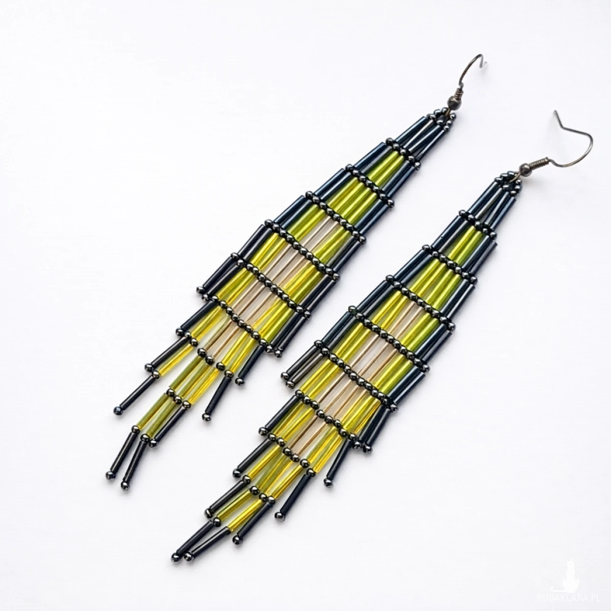 Kolczyki zostały ręcznie uszyte ze szklanych koralików w odcieniach złota hematytowego i szarości. Zawieszone na antyalergicznych biglach. Precyzyjne wykonanie gwarantuje trwałość i estetyczny wygląd.