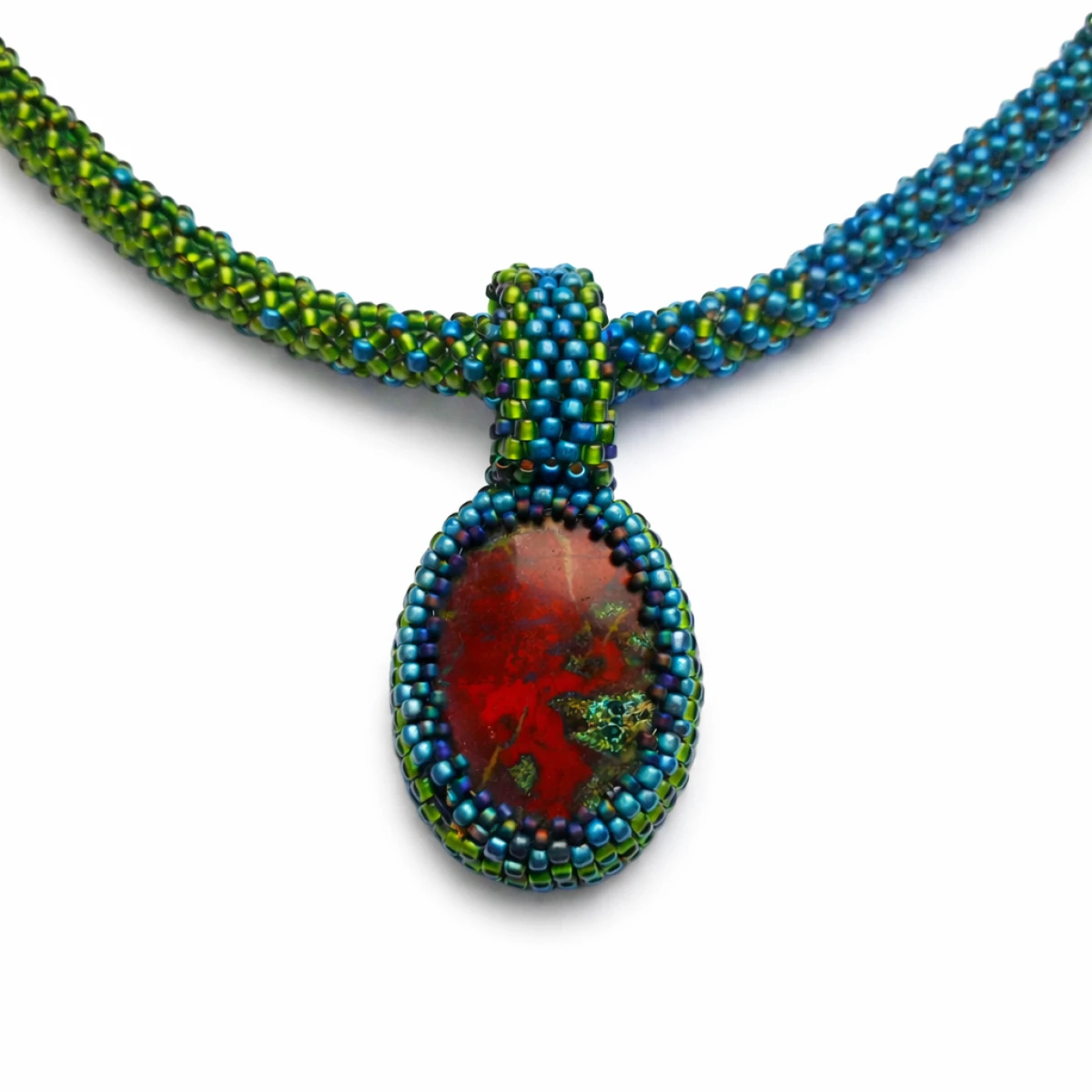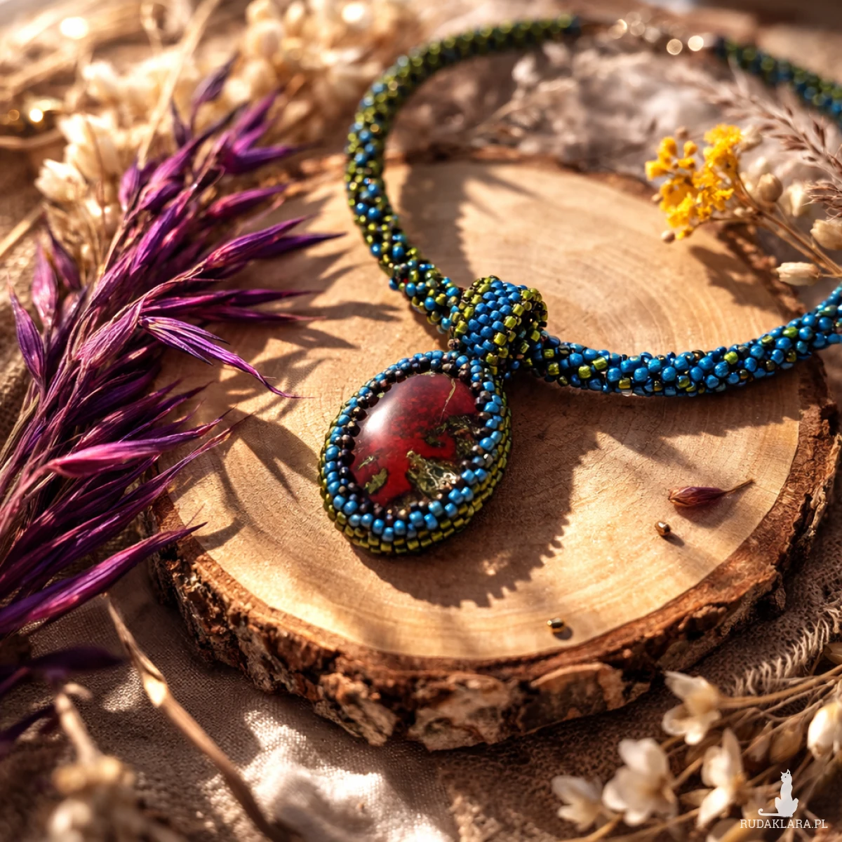 Unikatowy naszyjnik handmade z naturalnym jaspisem Smocza Krew, ręcznie obszyty tysiącami koralików. Wyrazista biżuteria etniczna w odcieniach turkusu, oliwki i czerwieni.