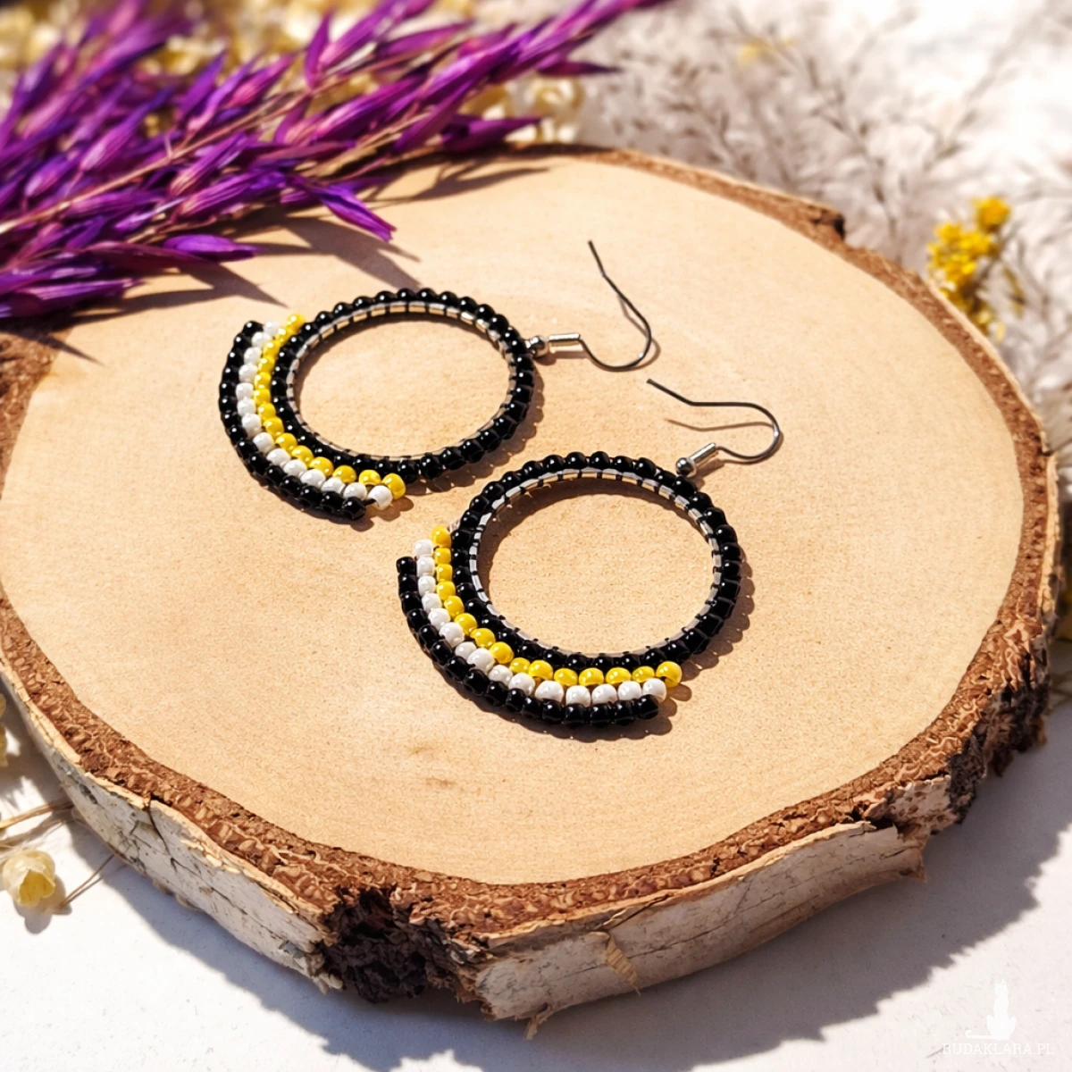 Wyraziste kolczyki w stylu etnicznym inspirowane geometrycznymi wzorami i motywem tradycyjnej kratki. Kontrast czerni, bieli i intensywnej żółci tworzy harmonijną, a jednocześnie przyciągającą uwagę kompozycję.