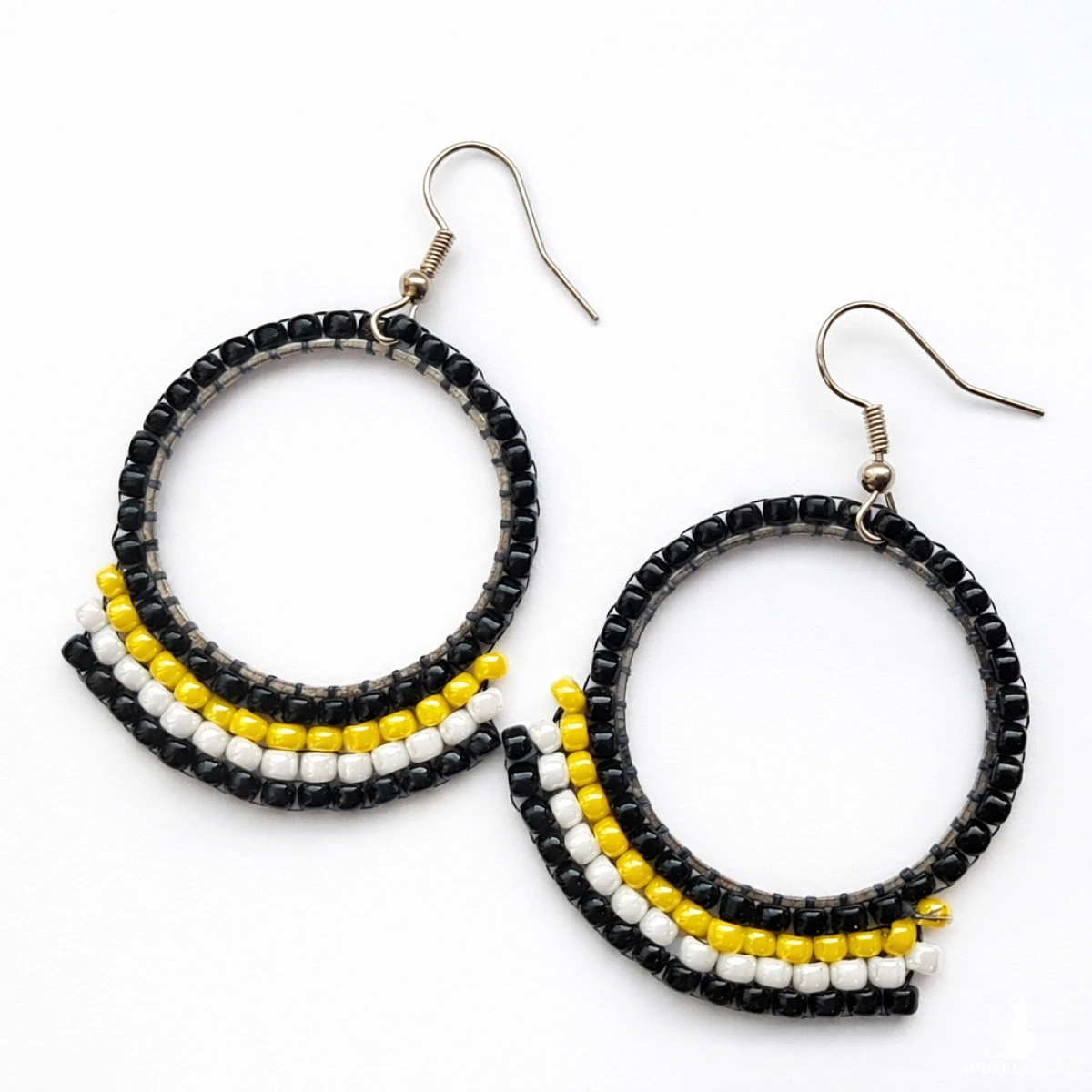 Kolczyki zostały ręcznie wykonane z wysokiej jakości koralików, osadzonych w geometrycznym wzorze. Zawieszone na stalowych biglach. Staranność wykonania zapewnia trwałość i estetyczne wykończenie.