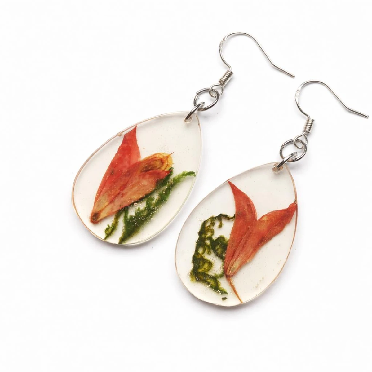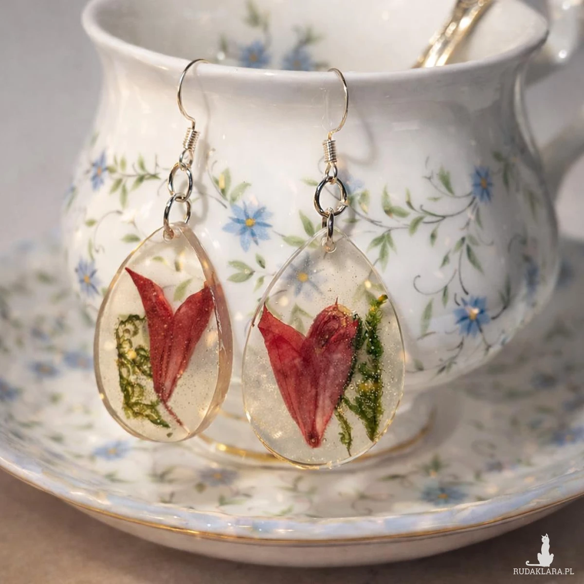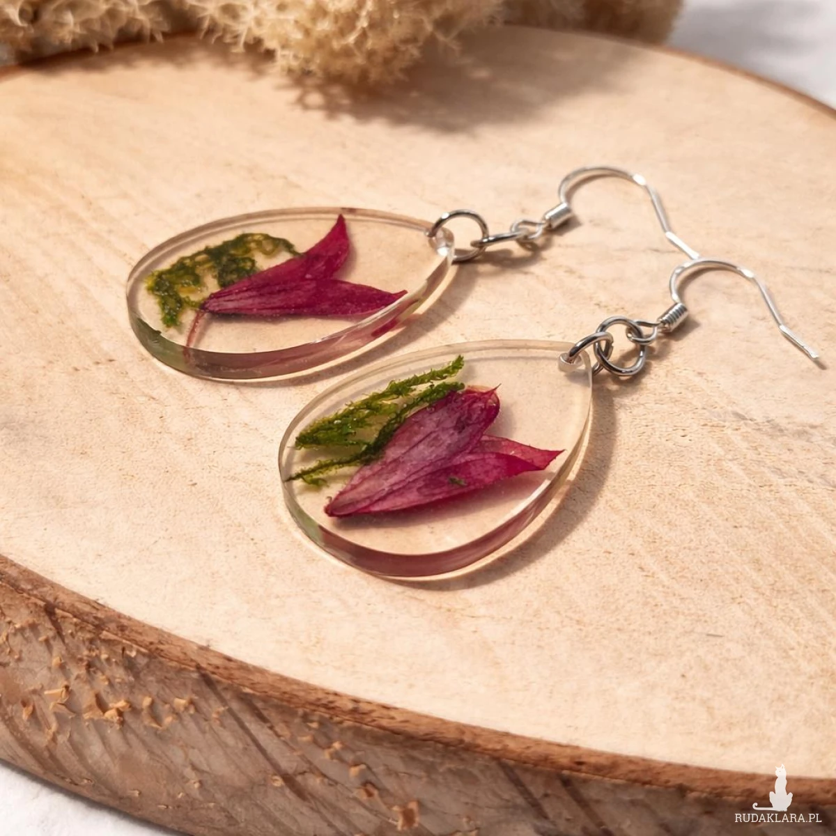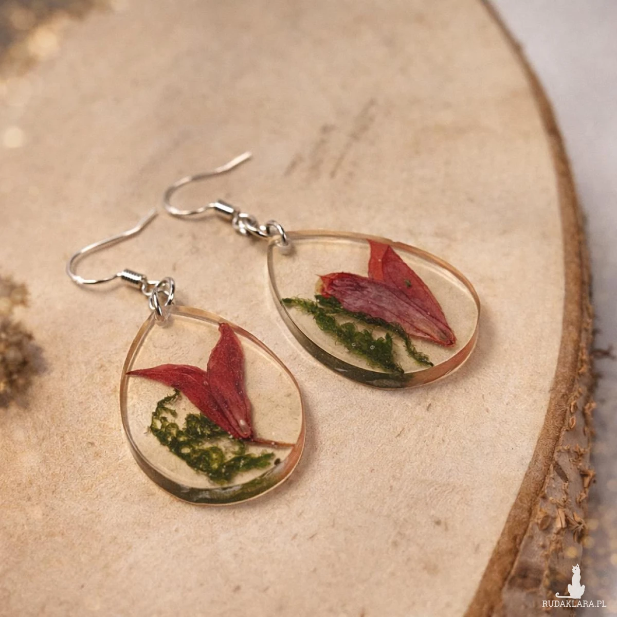 Oryginalne kolczyki handmade wykonane z krystalicznej żywicy, w której zatopione zostały prawdziwe czerwone kwiaty szałwii oraz naturalny zielony mech. Każda para jest jedyna w swoim rodzaju.