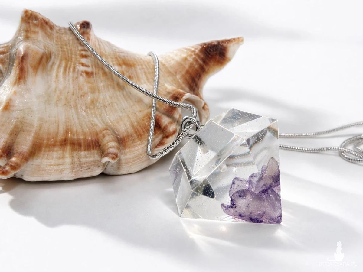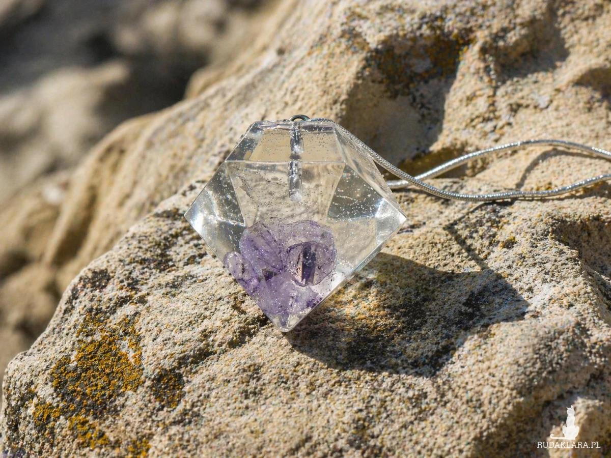 Ręcznie wykonany wisiorek z żywicy w formie diamentu z zatopionymi fragmentami ametystu to wyjątkowa biżuteria łącząca nowoczesny design z naturalnym pięknem kamienia. Subtelny połysk i geometryczna forma sprawiają, że przyciąga uwagę i dodaje stylu każdej stylizacji.