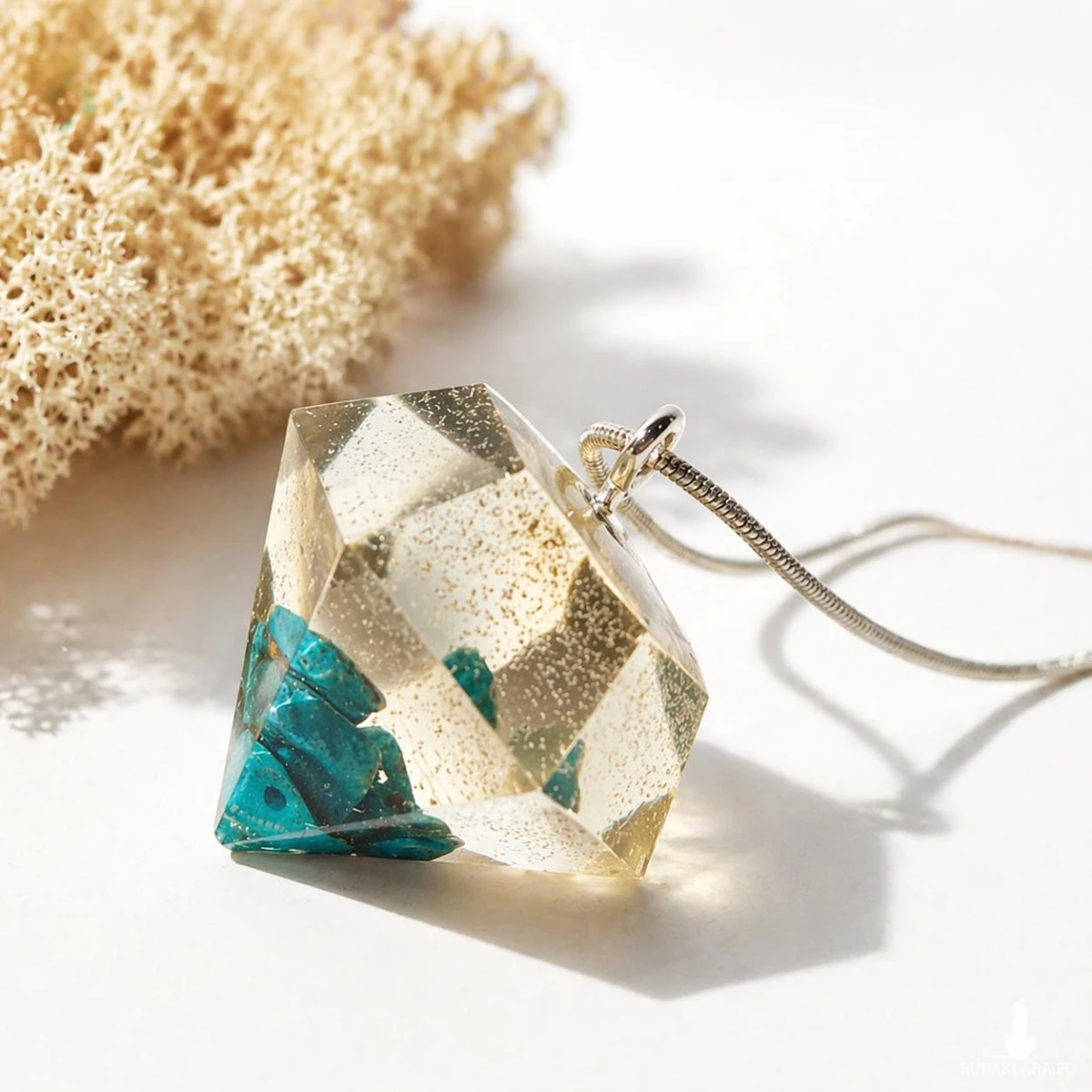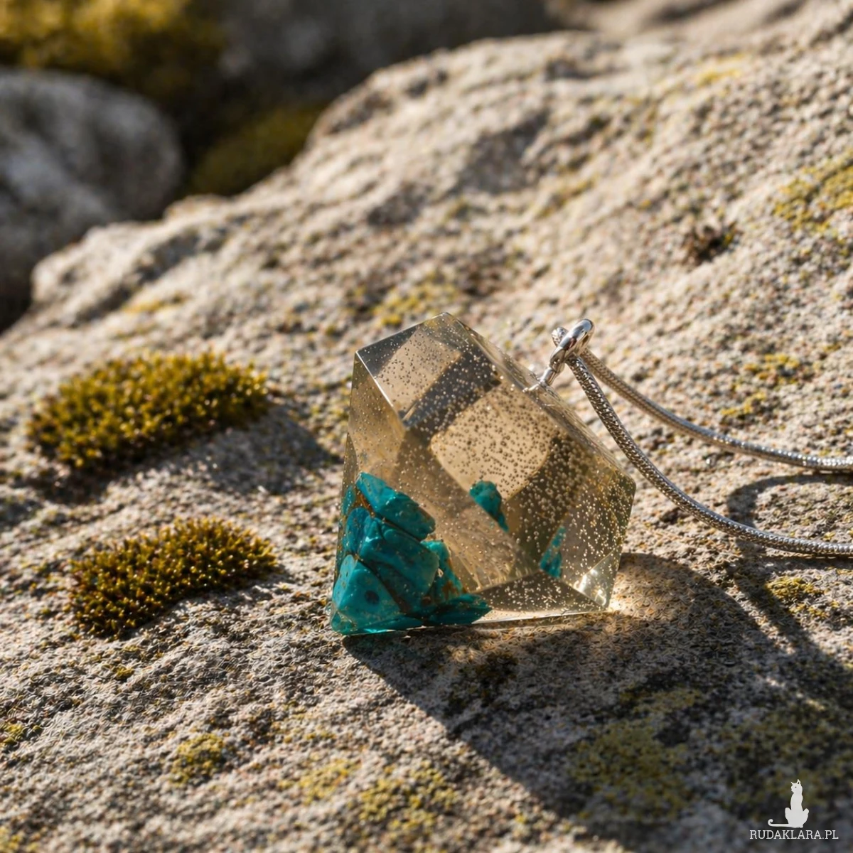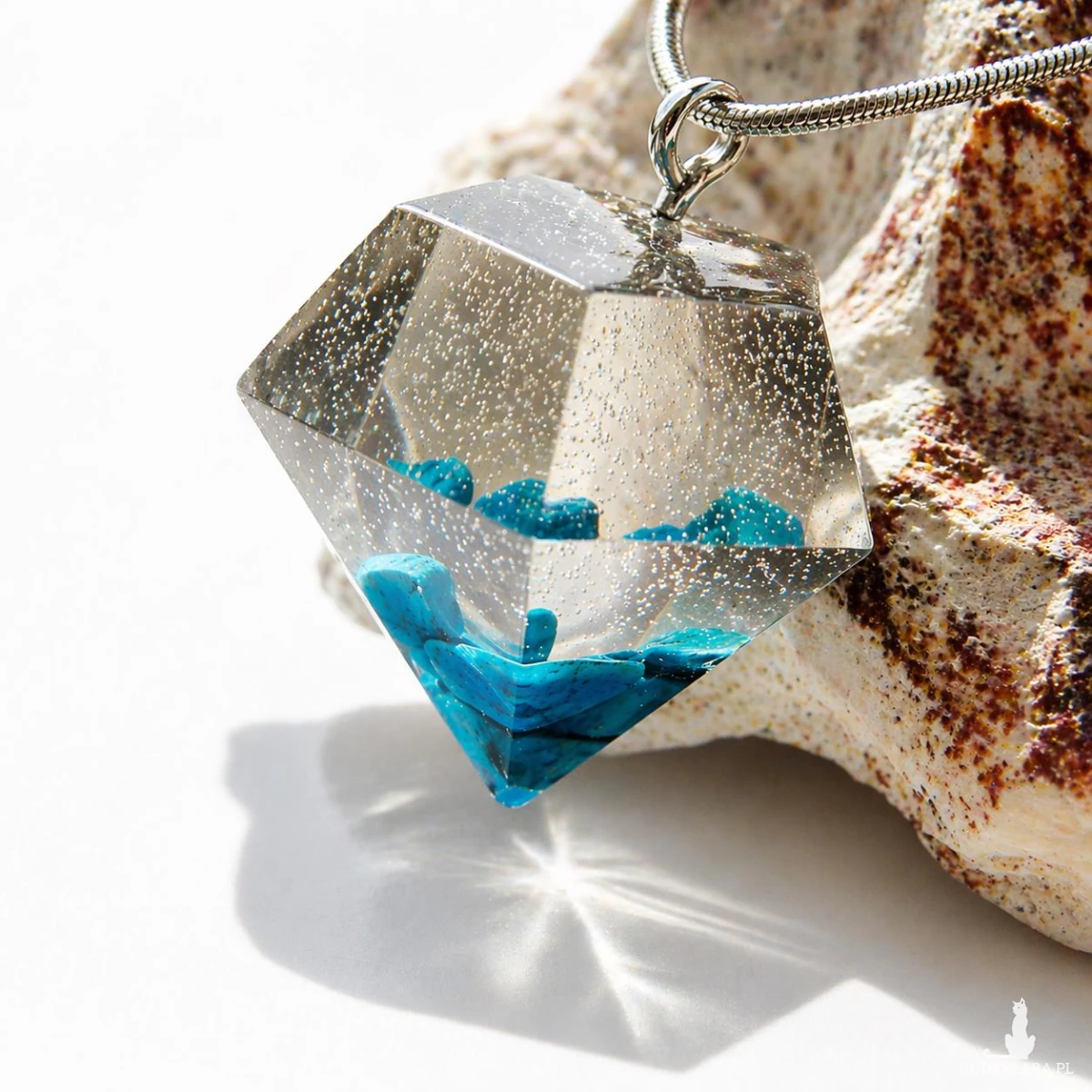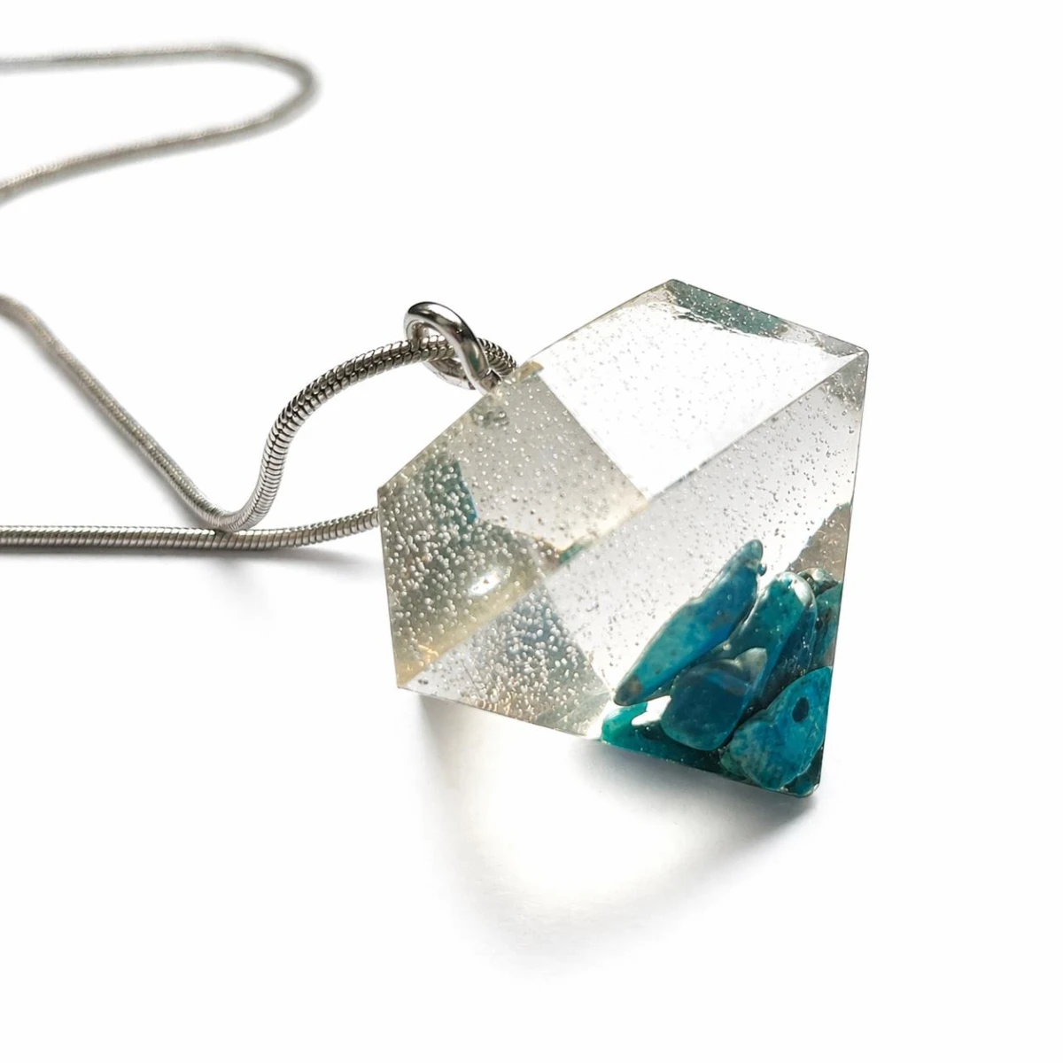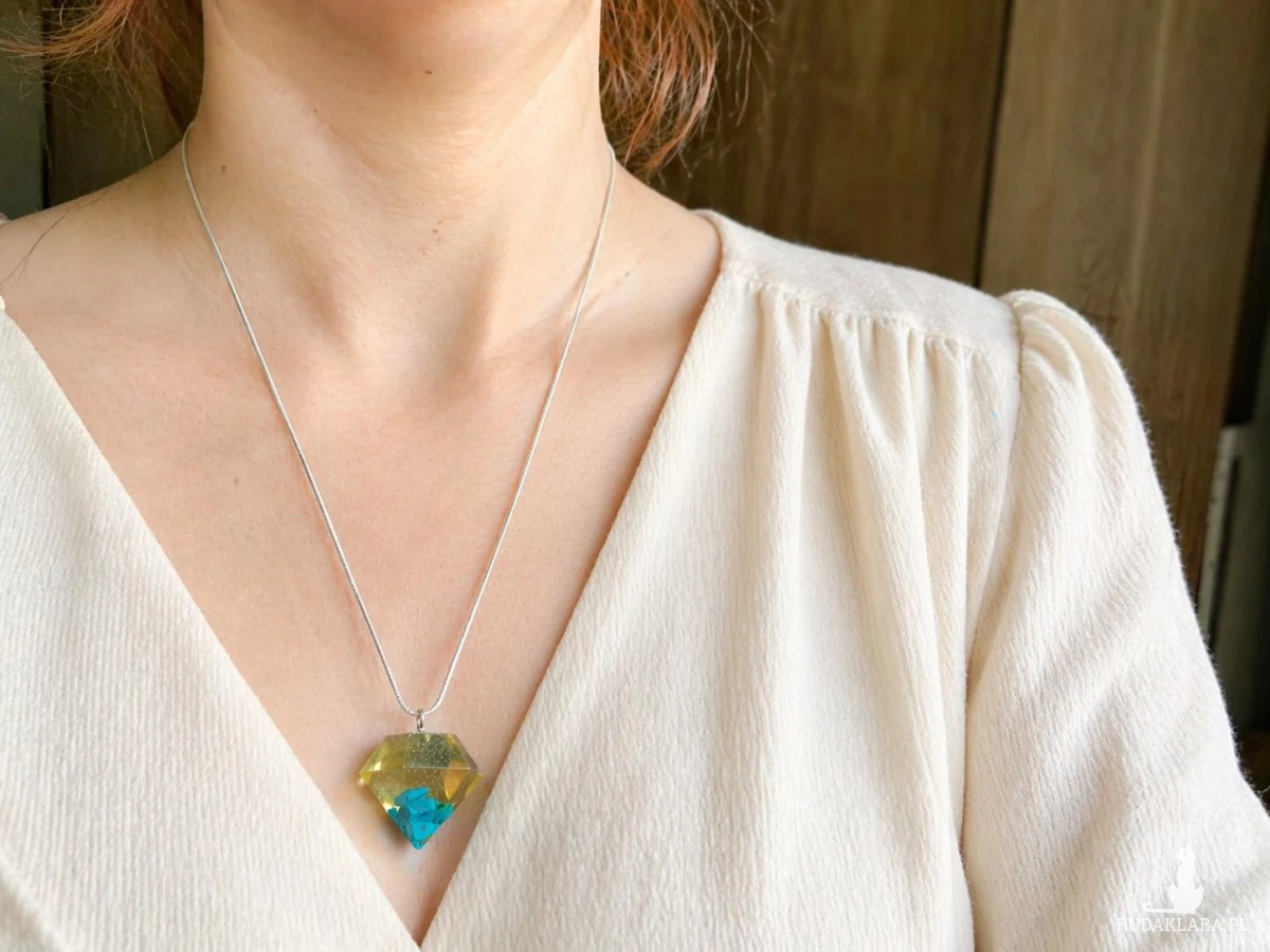 Ten ręcznie wykonany wisiorek z żywicy w kształcie diamentu to połączenie nowoczesnej formy z naturalnym pięknem kamienia. Zatopione fragmenty turkusu tworzą wyjątkową kompozycję, która przyciąga wzrok i nadaje biżuterii charakteru.
