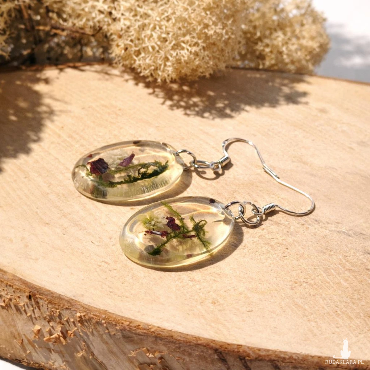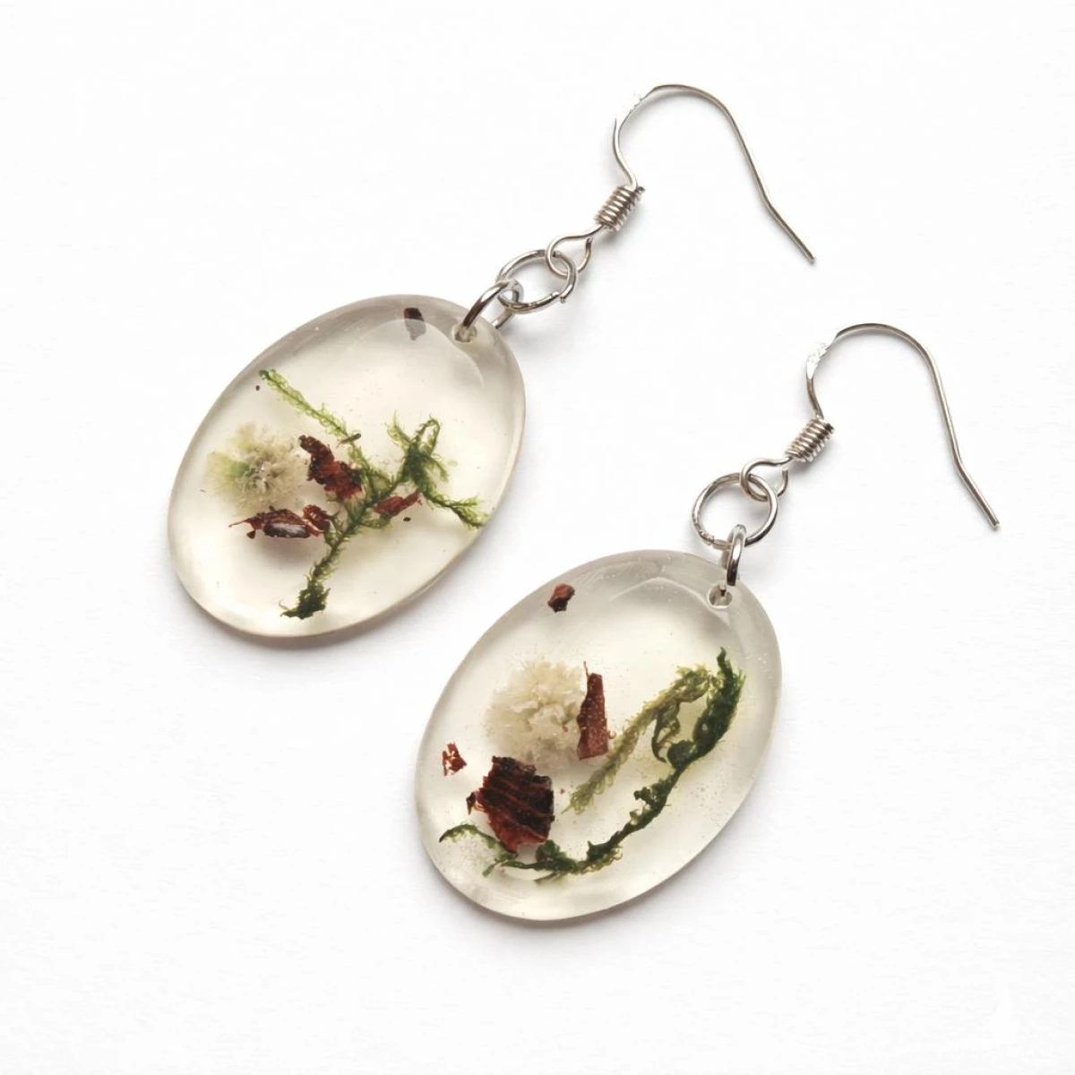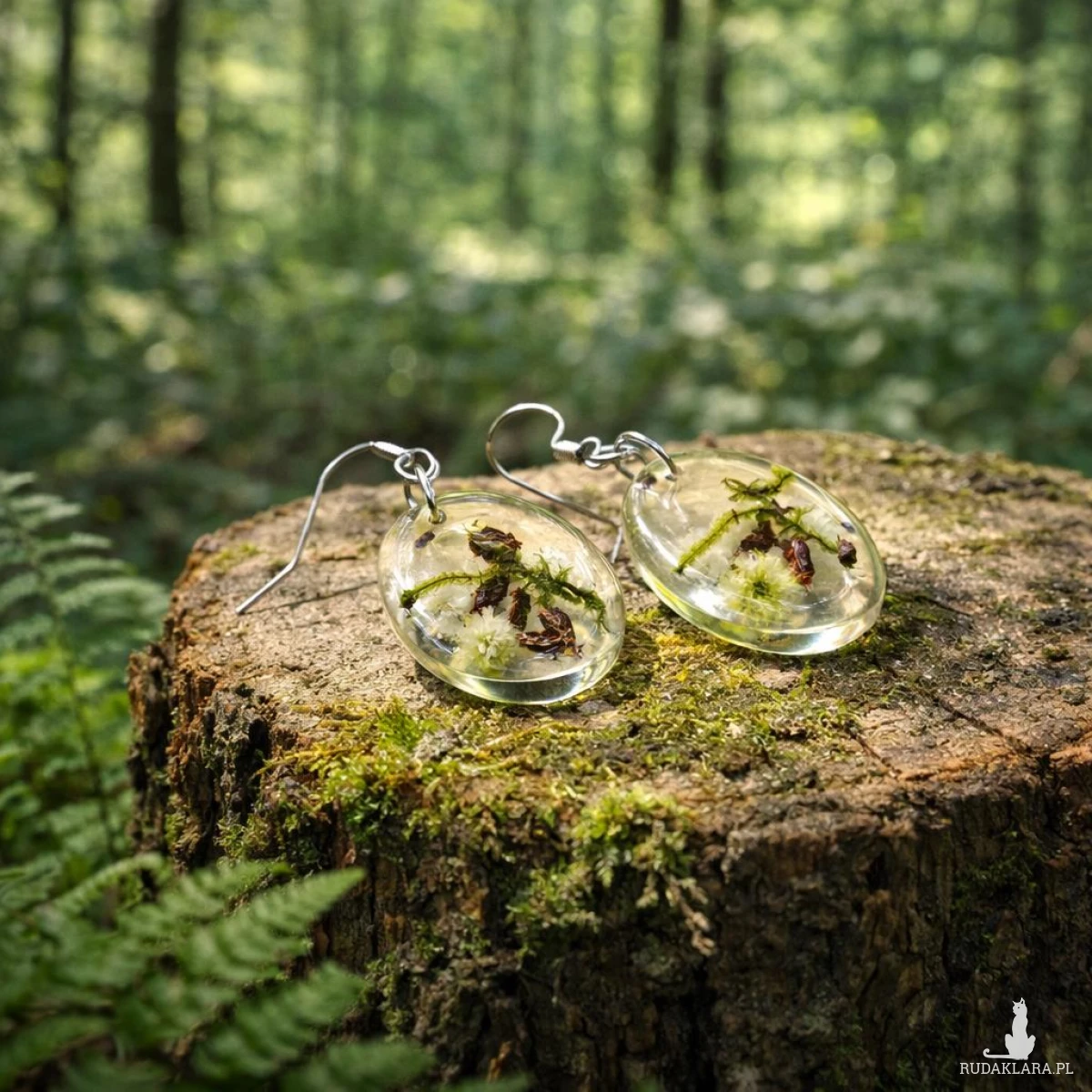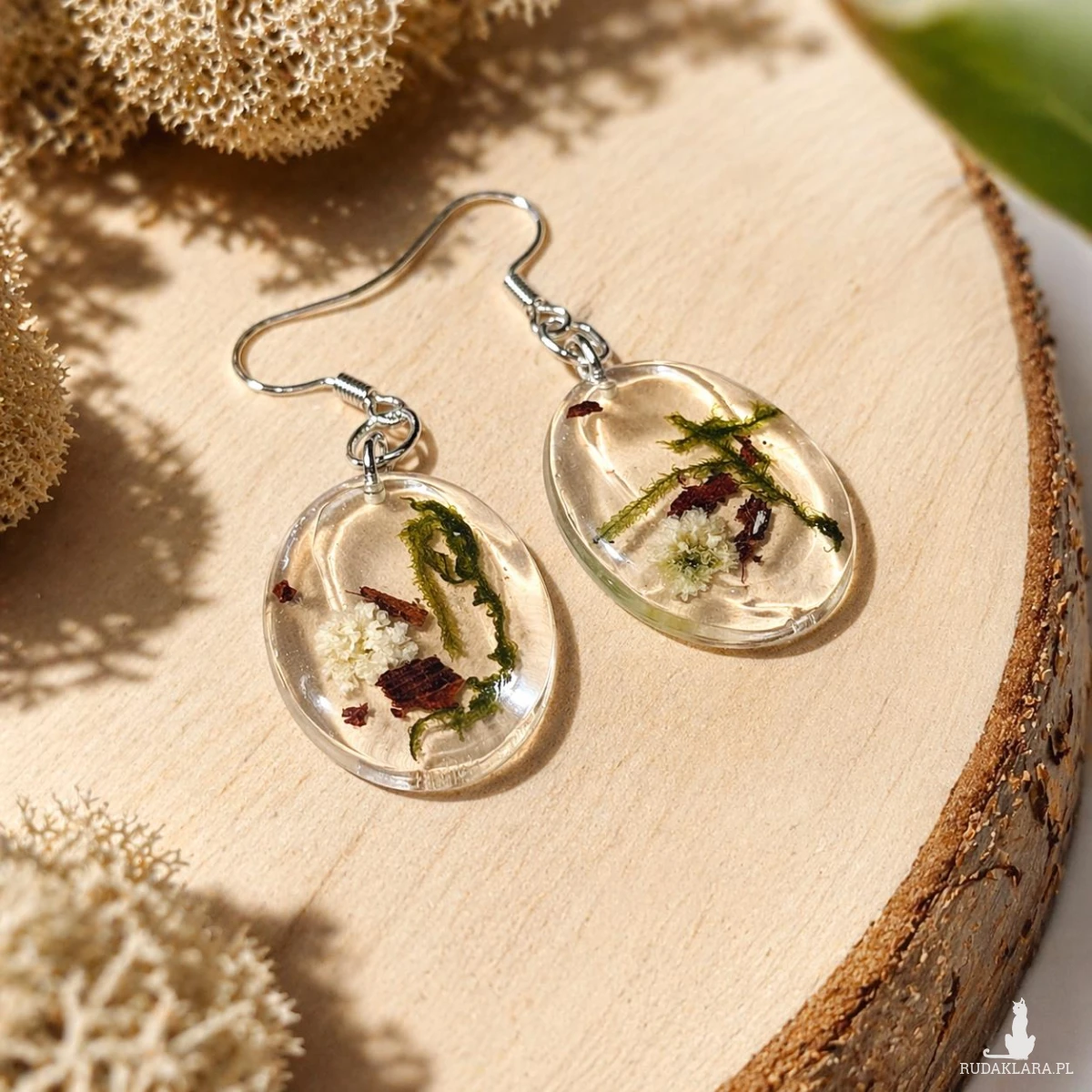 Unikatowe kolczyki handmade, w których zatopione zostały prawdziwe elementy natury: zielony mech, fragmenty kory oraz delikatna biała gipsówka. Transparentna żywica podkreśla ich strukturę, tworząc efekt miniaturowego ekosystemu.