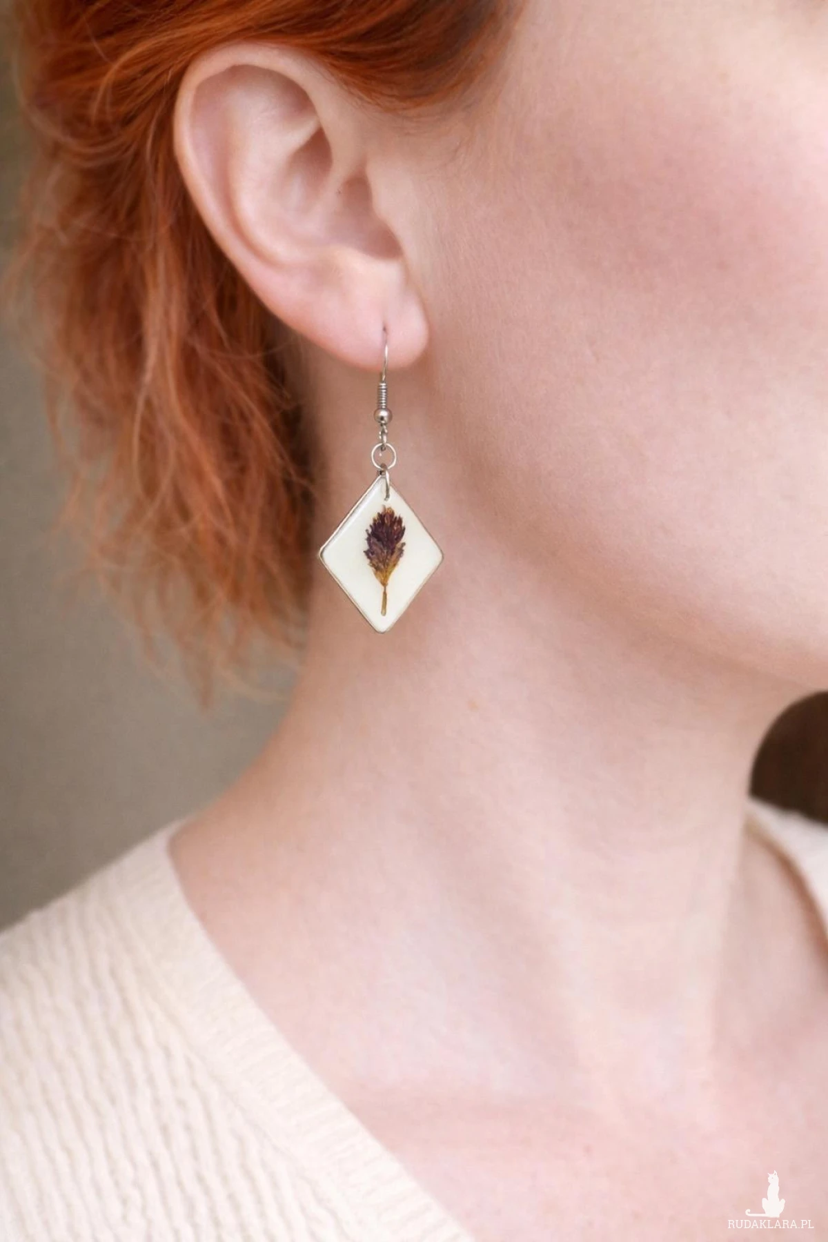 Delikatne kolczyki z żywicy epoksydowej z zatopionymi naturalnymi kwiatami koniczyny w odcieniach fioletu. Jasne, białe tło pięknie podkreśla detale rośliny, nadając biżuterii elegancji i lekkości.