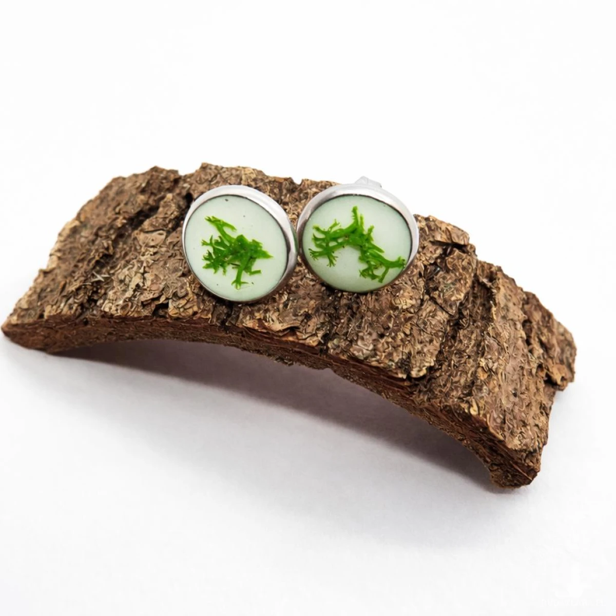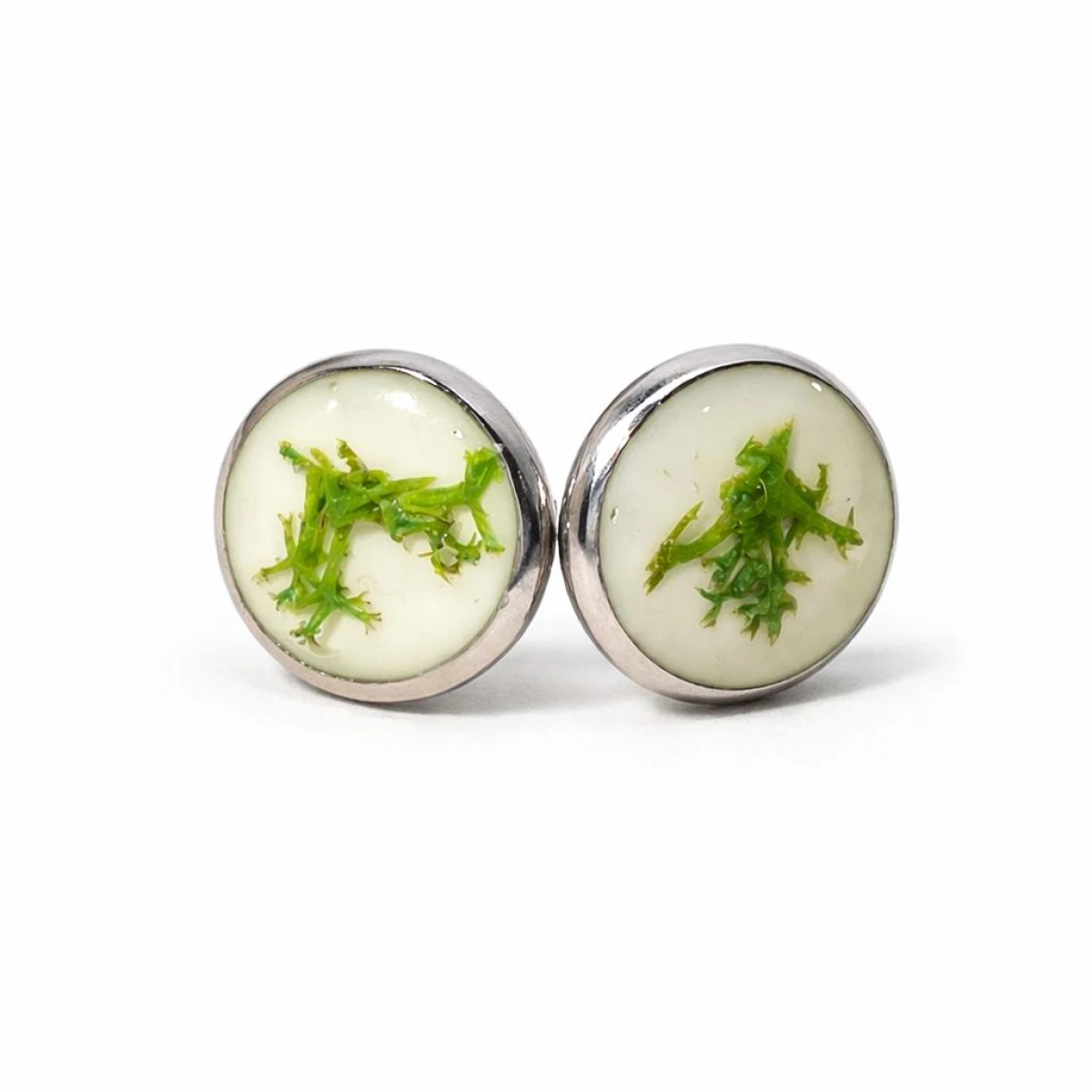 Subtelne kolczyki wkrętki wykonane z krystalicznej żywicy z zatopionym naturalnym mchem chrobotkiem. Minimalistyczny design i srebrna oprawa sprawiają, że są idealnym dodatkiem do codziennych stylizacji.