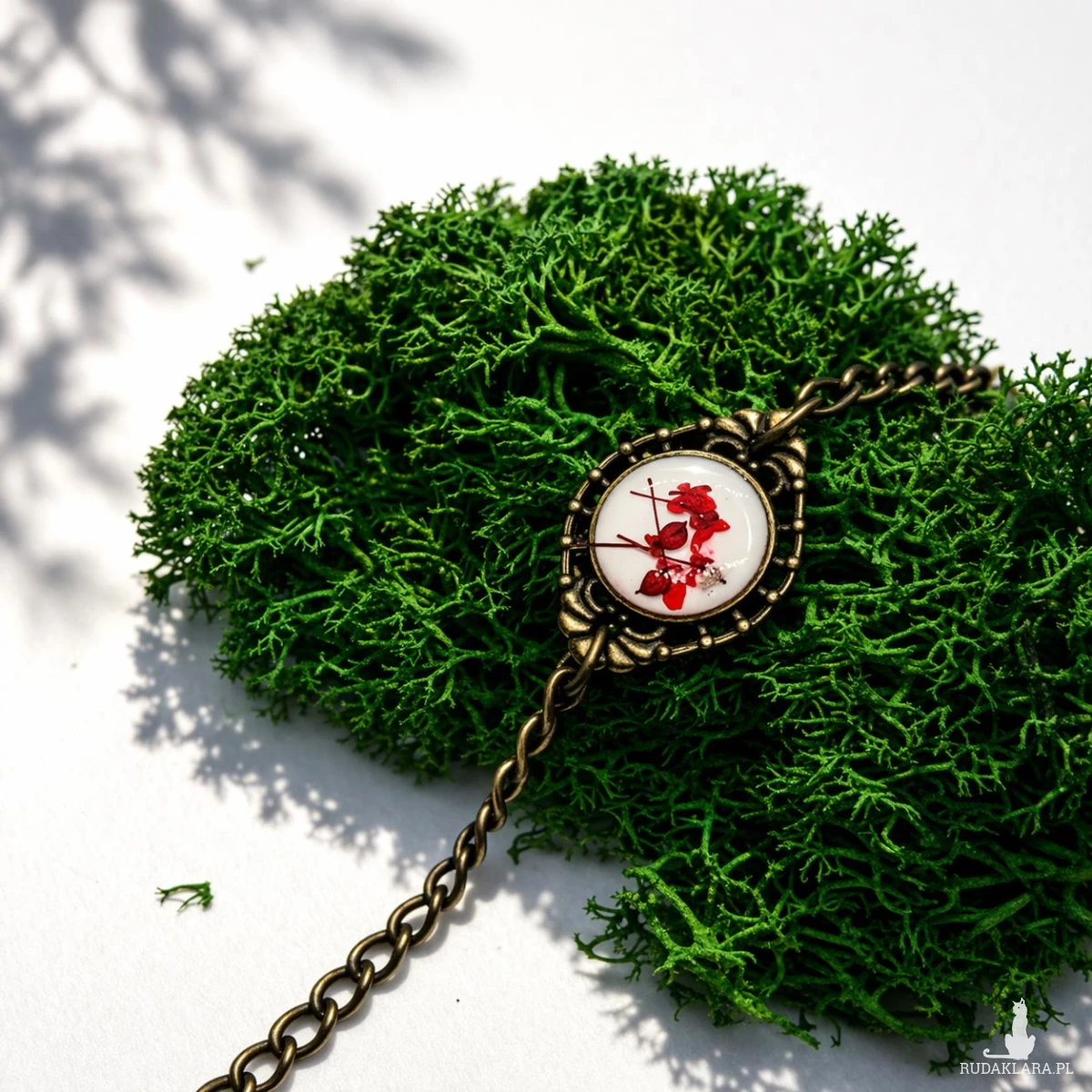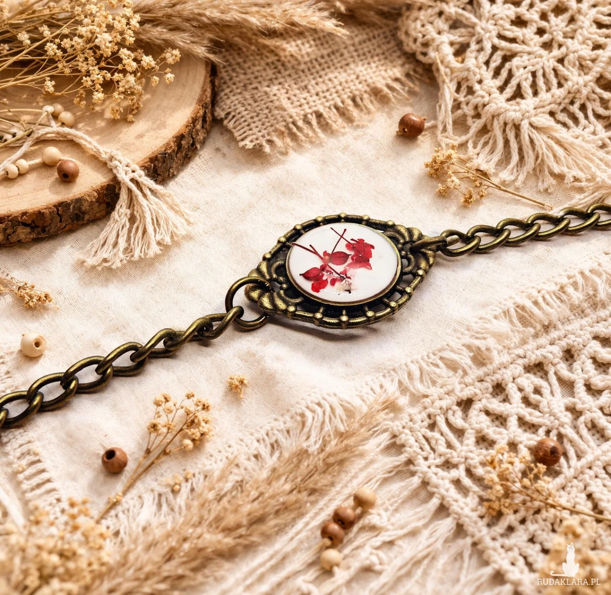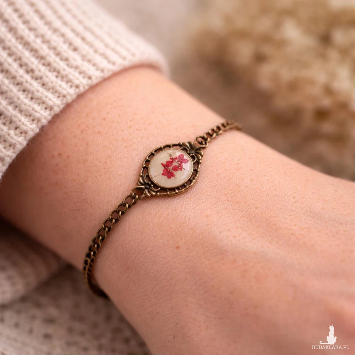 Elegancka i delikatna bransoletka z żywicy z naturalnymi czerwonymi kwiatami smagliczki, zatopionymi w krystalicznej żywicy na jasnym tle. Całość osadzona w oprawie w kolorze starego złota, co nadaje biżuterii wyjątkowego, vintage charakteru.