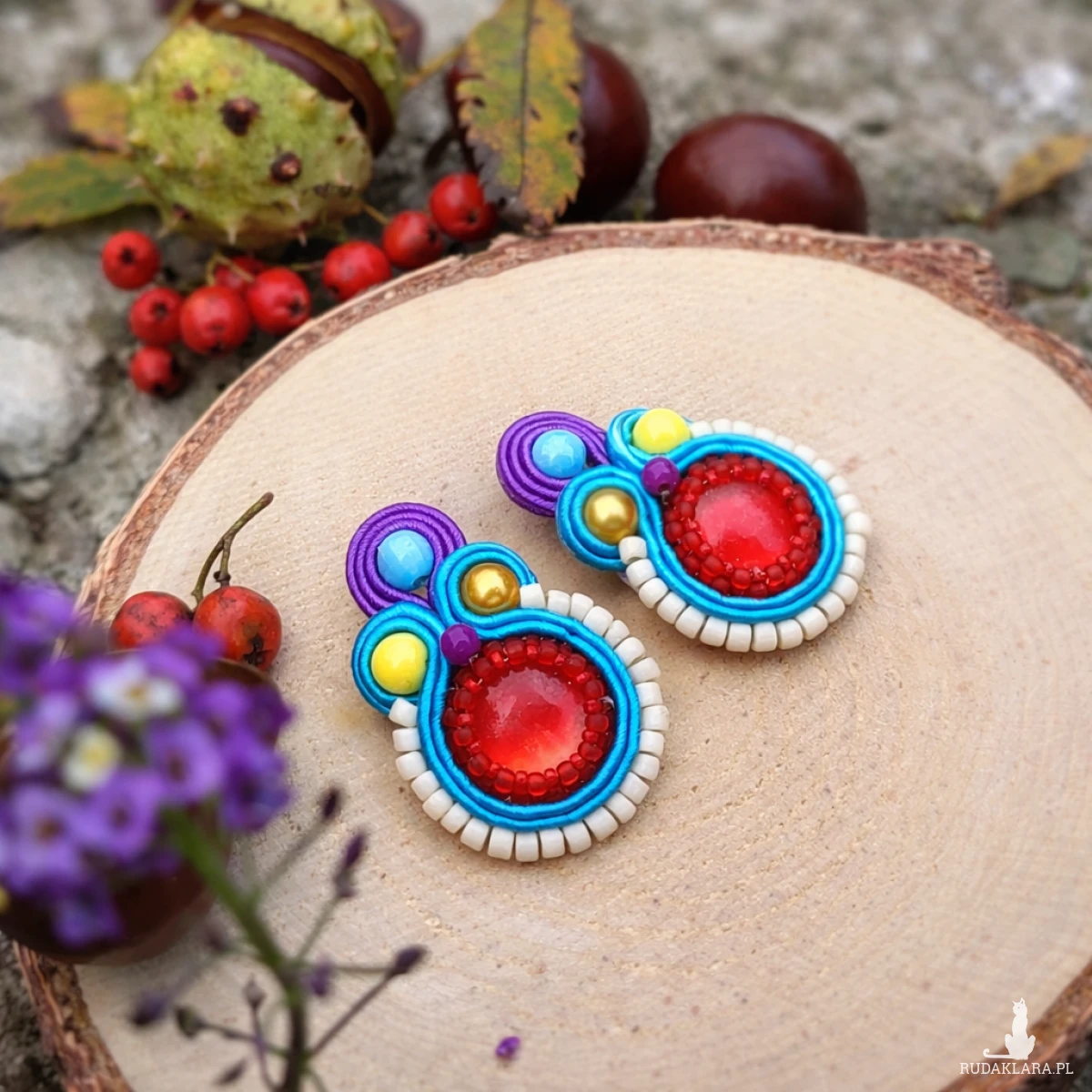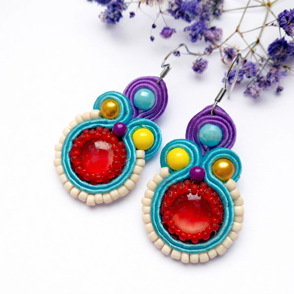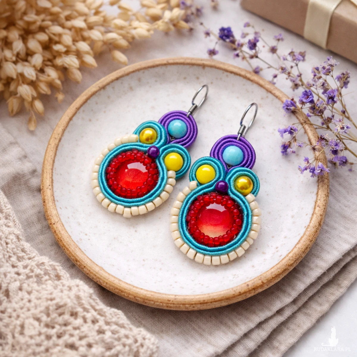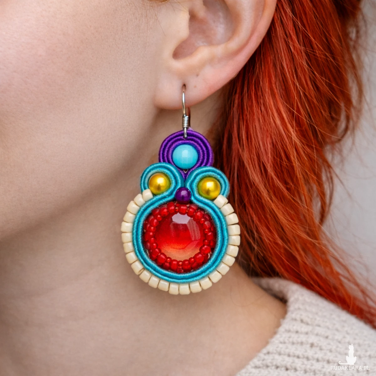 Unikatowe kolczyki wykonane techniką sutasz to propozycja dla kobiet ceniących oryginalność i artystyczne dodatki. Centralnym elementem biżuterii jest czerwony kaboszon otoczony drobnymi koralikami oraz dekoracyjnym sznurkiem soutache w odcieniach turkusu, fioletu i żółci.