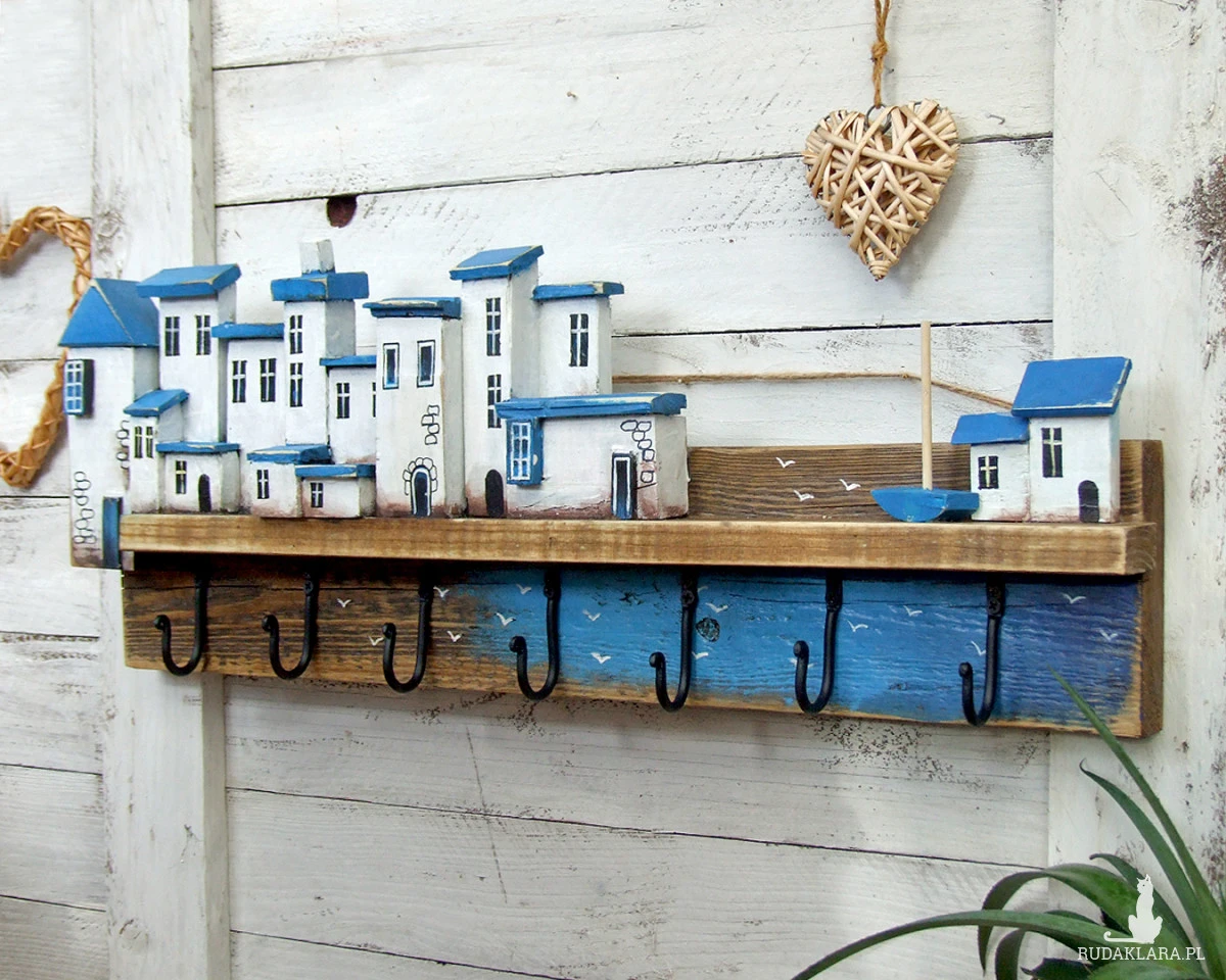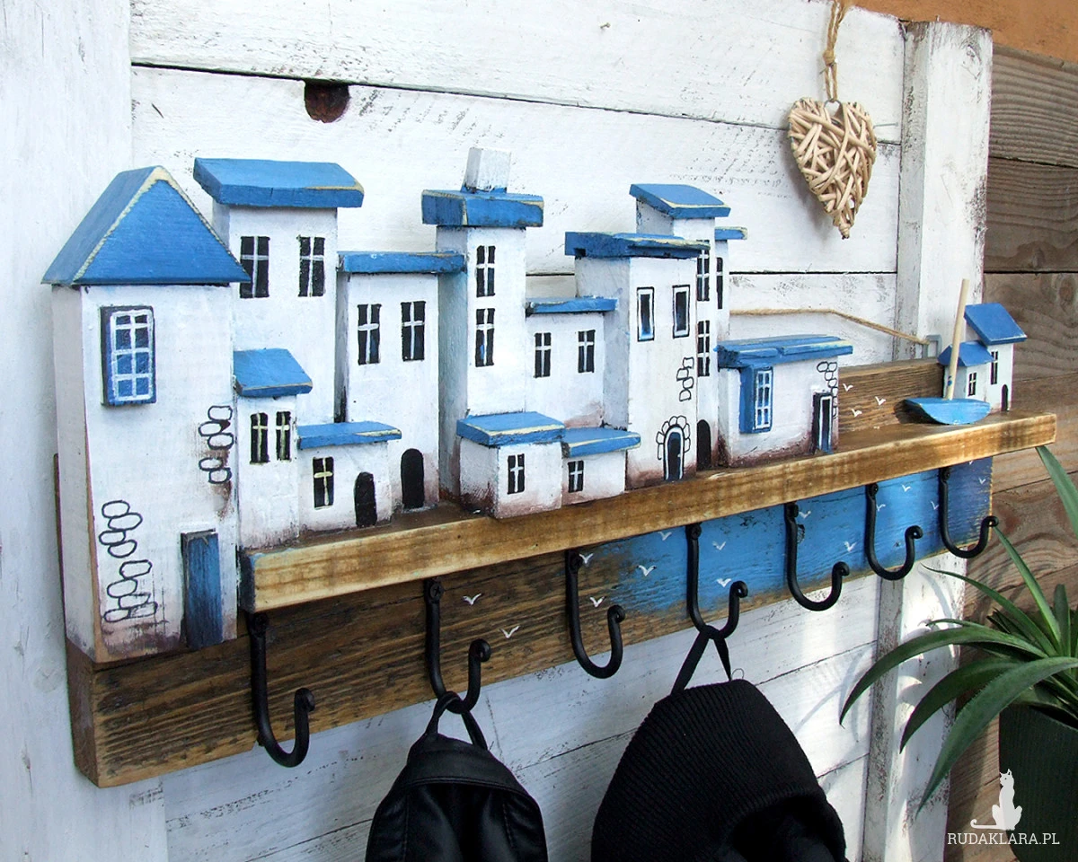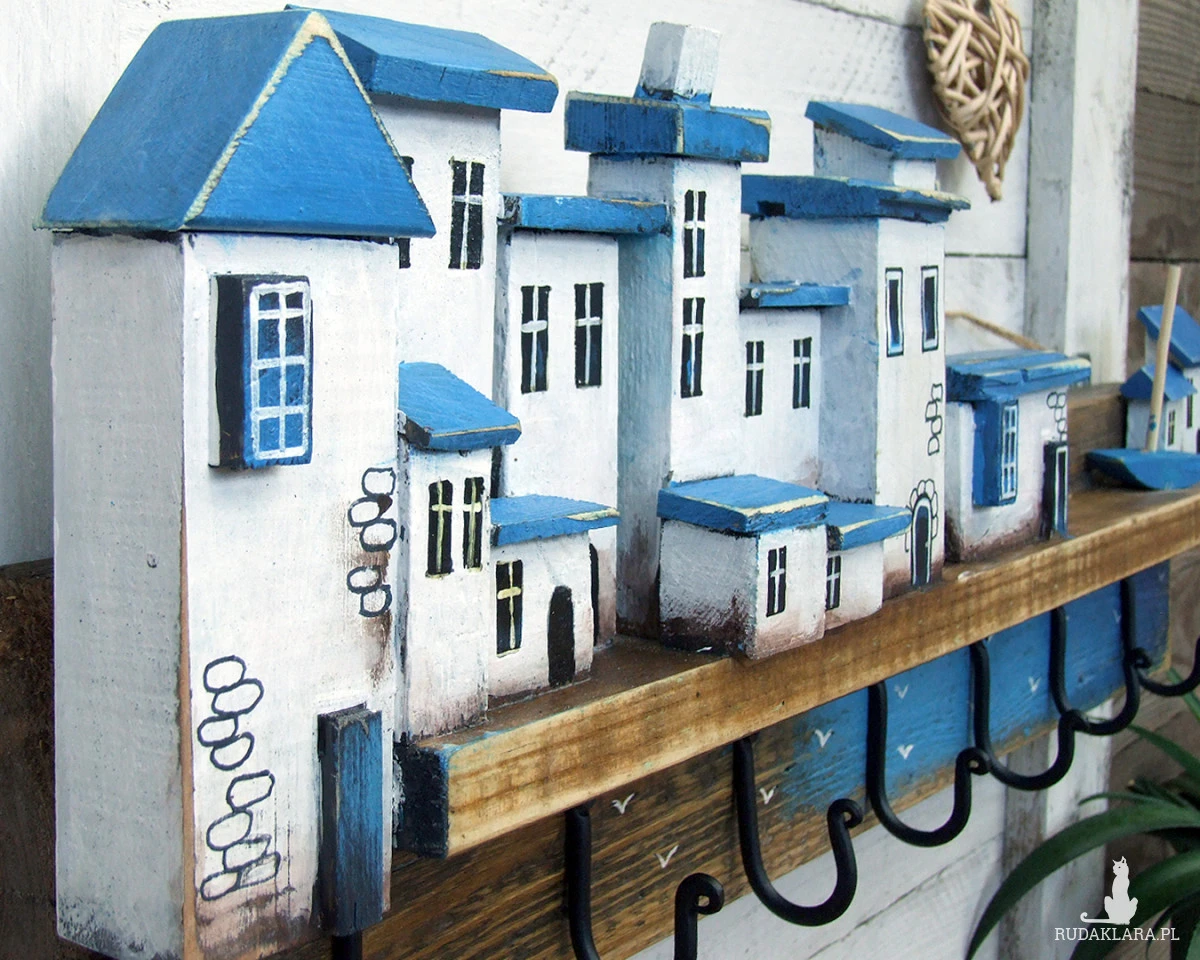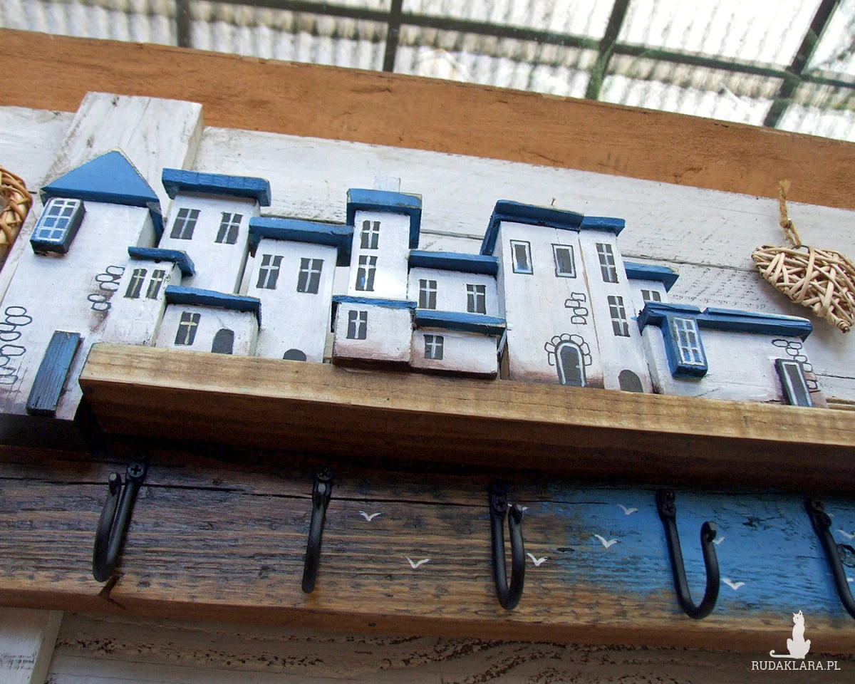 Duży wieszak ścienny na ubrania, wykonany ze starych sosnowych desek i belek - białe domki z niebieskimi daszkami stoją ciasno obok siebie - to jakby uliczka na nabrzeżu w nadmorskim miasteczku.
