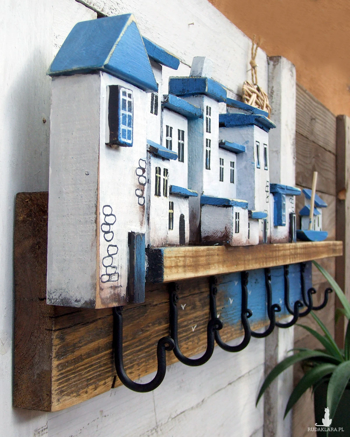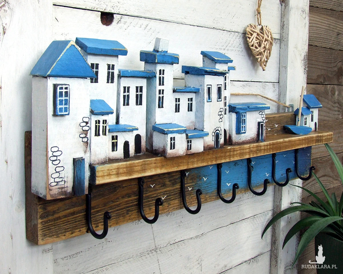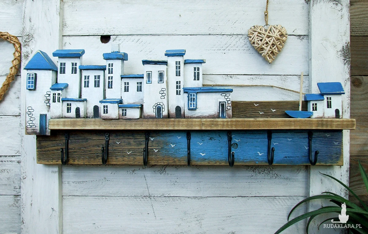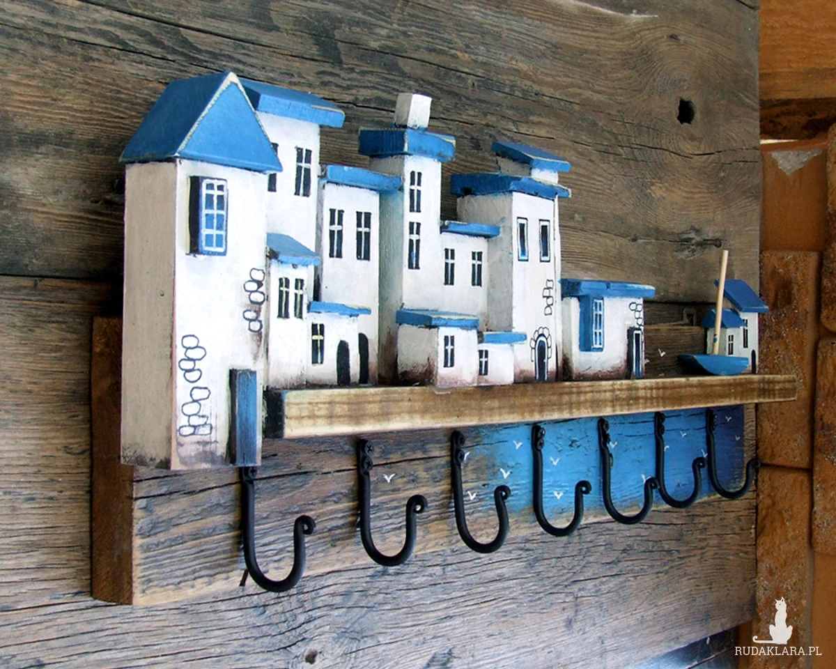 Duży wieszak ścienny na ubrania, wykonany ze starych sosnowych desek i belek - białe domki z niebieskimi daszkami stoją ciasno obok siebie - to jakby uliczka na nabrzeżu w nadmorskim miasteczku.