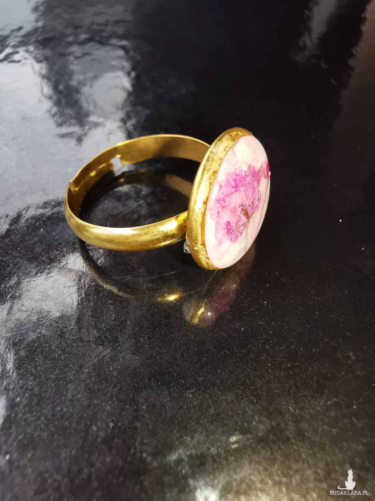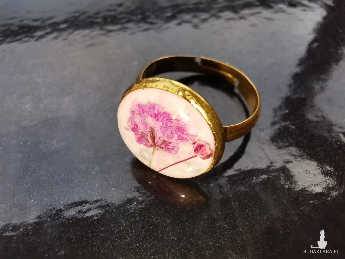 Pierścionek ze stali z różowa gipsówką i odrobiną perełek. Regulowany.
