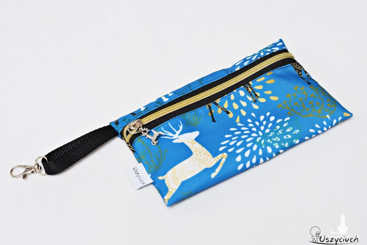 Etui, saszetka na klucze lub na telefon uszyte z wodoodpornej tkaniny. Sprawdzi się także jako etui na artykuły higieniczne do torebki. Saszetka posiada karabińczyk do którego możesz przyczepić np. klucze i schować je do środka.