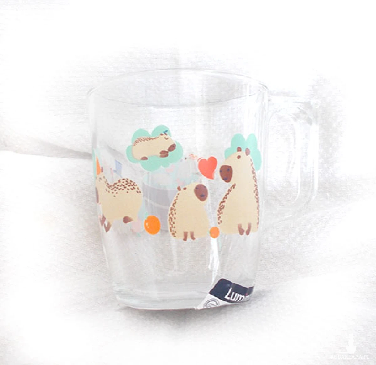 Nowa, kolorowa szklaneczka z bajkowymi kapibarami. Wymiary: 10,5 cm x 9 cm. Pojemność 250 ml, marka: "Luminarc", wysoka jakość. Nadaje się do mikrofalówki oraz do zmywarki.