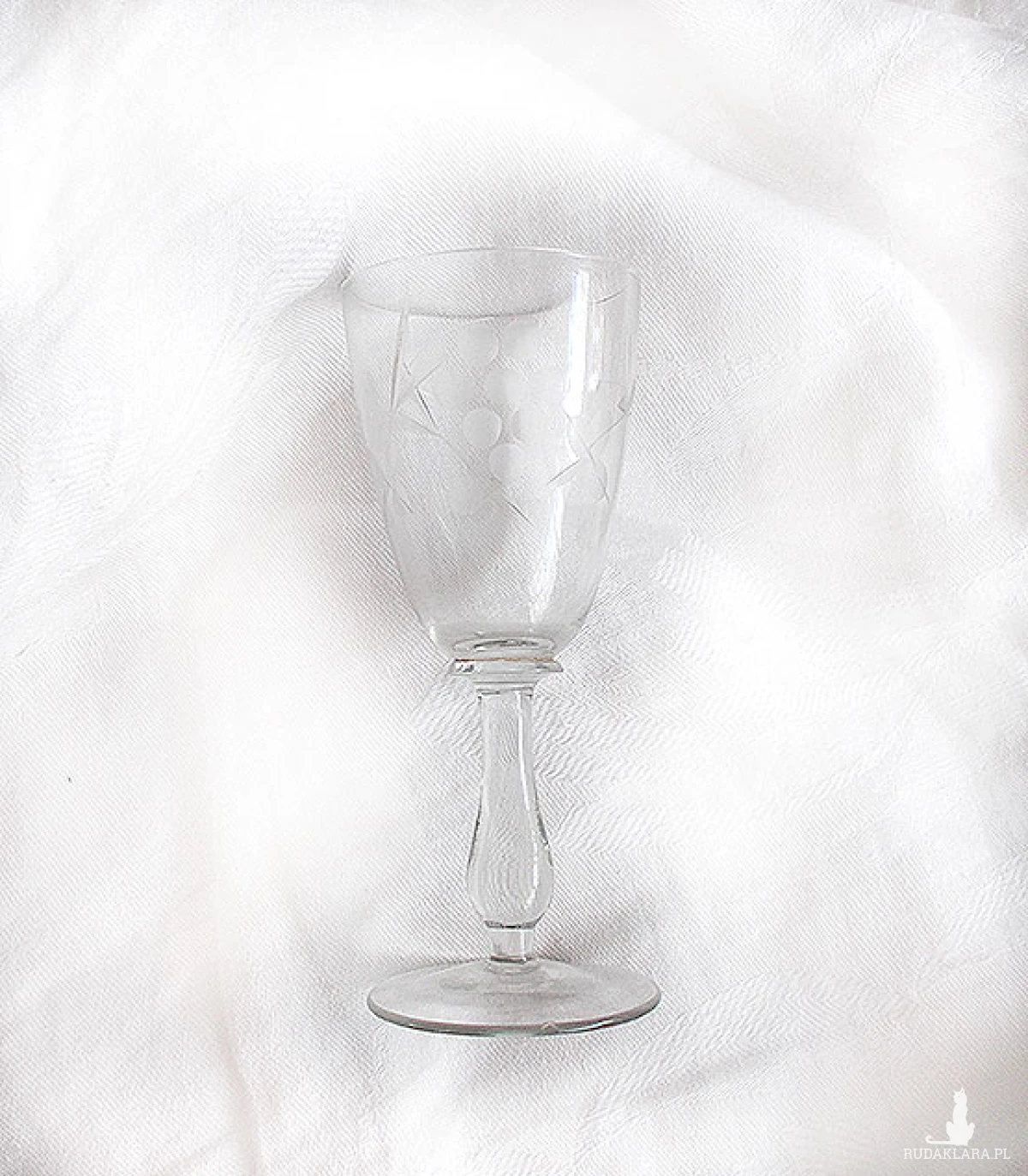 Oryginalny przedmiot vintage z czasów PRL, XX w. Szklany kieliszek z grawerowanym wzorem. Wymiary: wysokość 11,5 cm, szerokość 4 cm.