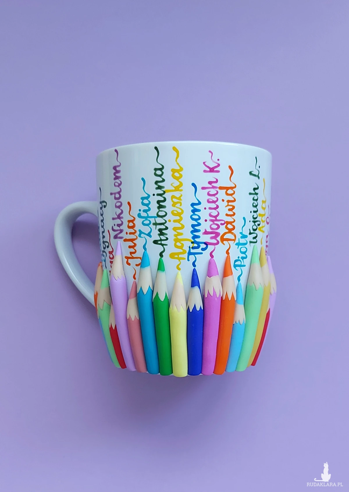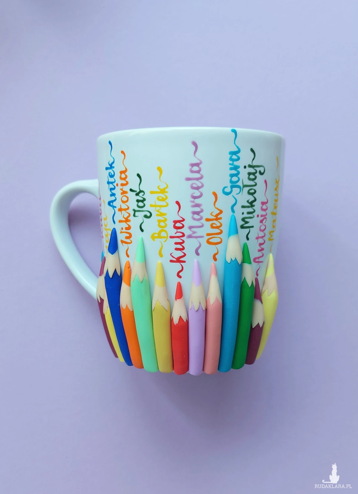 Kubeczek z ozdobą- kredkami- wykonanymi z gliny polimerowej. Imiona napisane są farbami do ceramiki. Z kubeczka można normalnie korzystać jedynie przestrzegając kilku zasad (do kubeczka dołączam dokładną instrukcję jak najlepiej dbać o kubeczek).