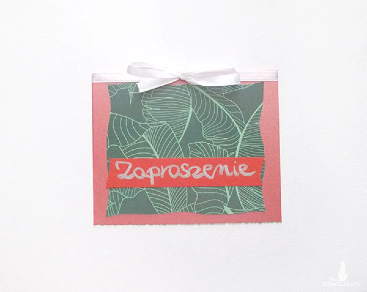 Uniwersalne, otwierane zaproszenie na dowolną imprezę, okazję, wydarzenie, uroczystość. Zaproszenie jest bez tekstu, dołączona biała koperta. Przód ciemnozielony ze wzorem w liście, czerwono perłowy kartonik, biała wstążeczka.