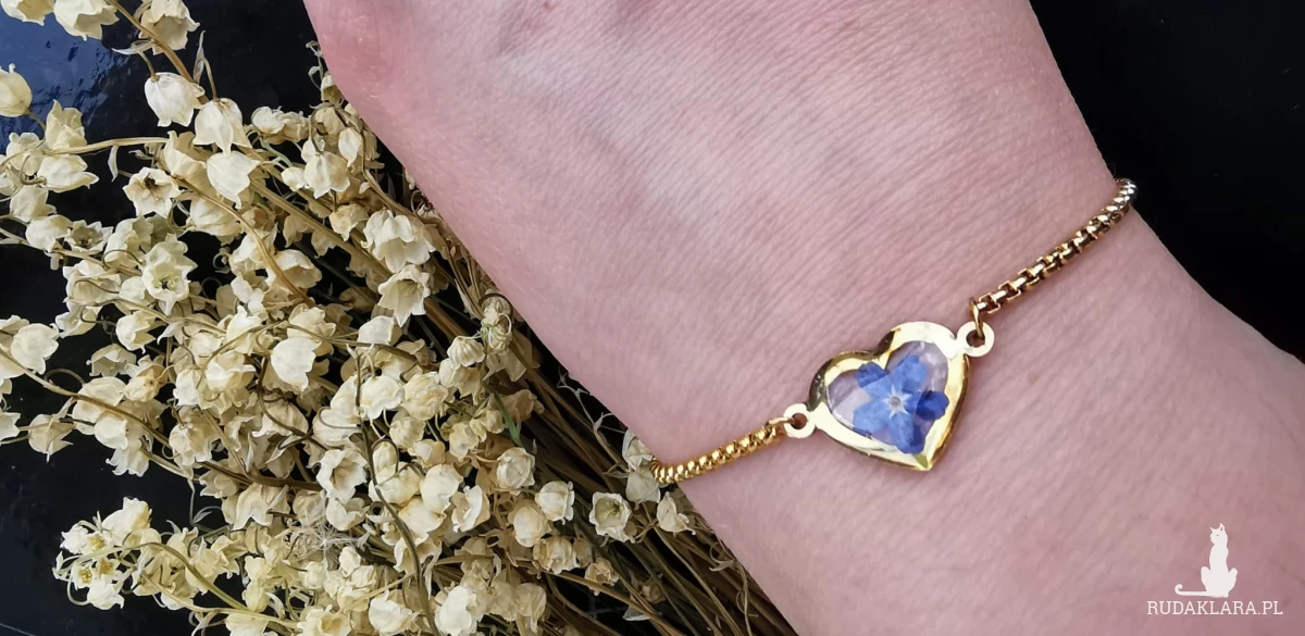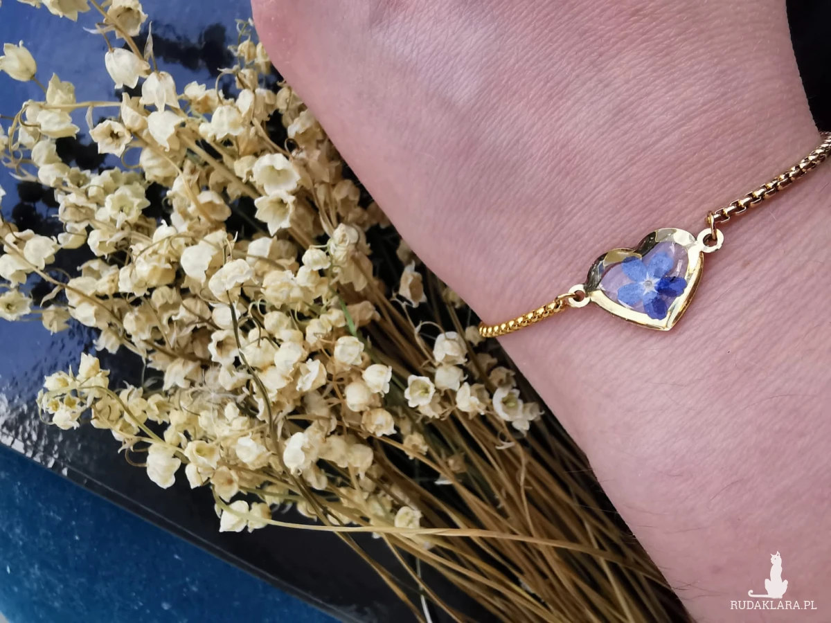 Bransoletka na złotej stali. W środku jest zatopiona prawdziwa suszona niezapominajka, wymiary oczka to 15*10mm.