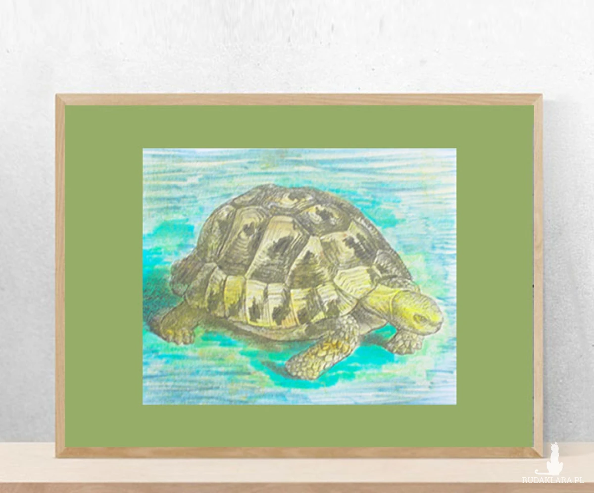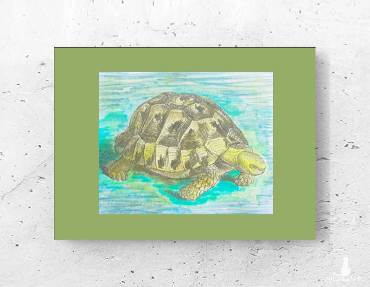 Obrazek w stylu retro. Grafika z żółwiem na oliwkowym kartoniku 21 x 30 cm. Poster do samodzielnej oprawy. Plakat wystarczy tylko