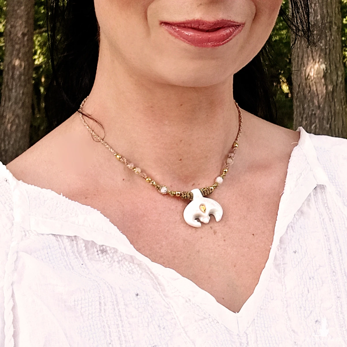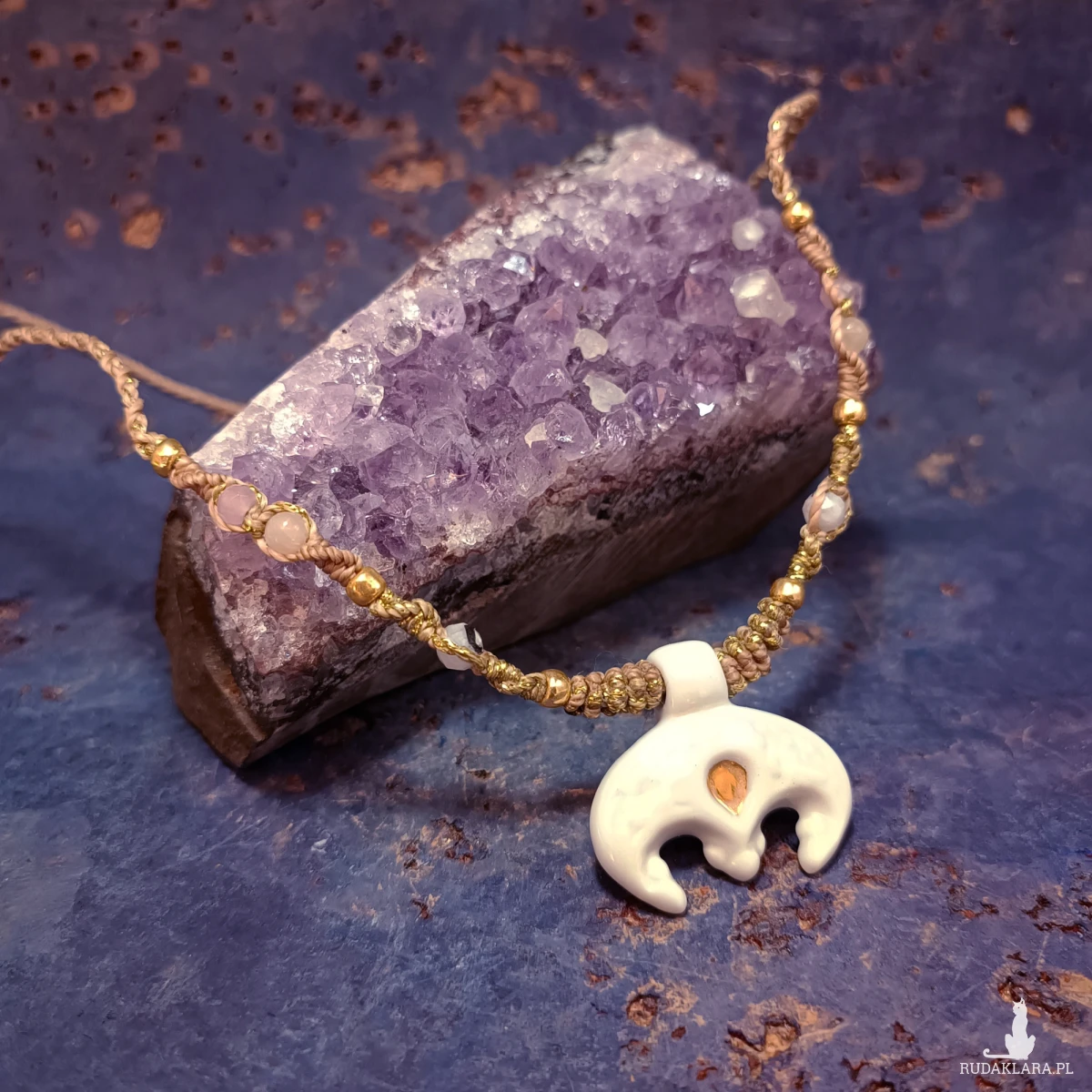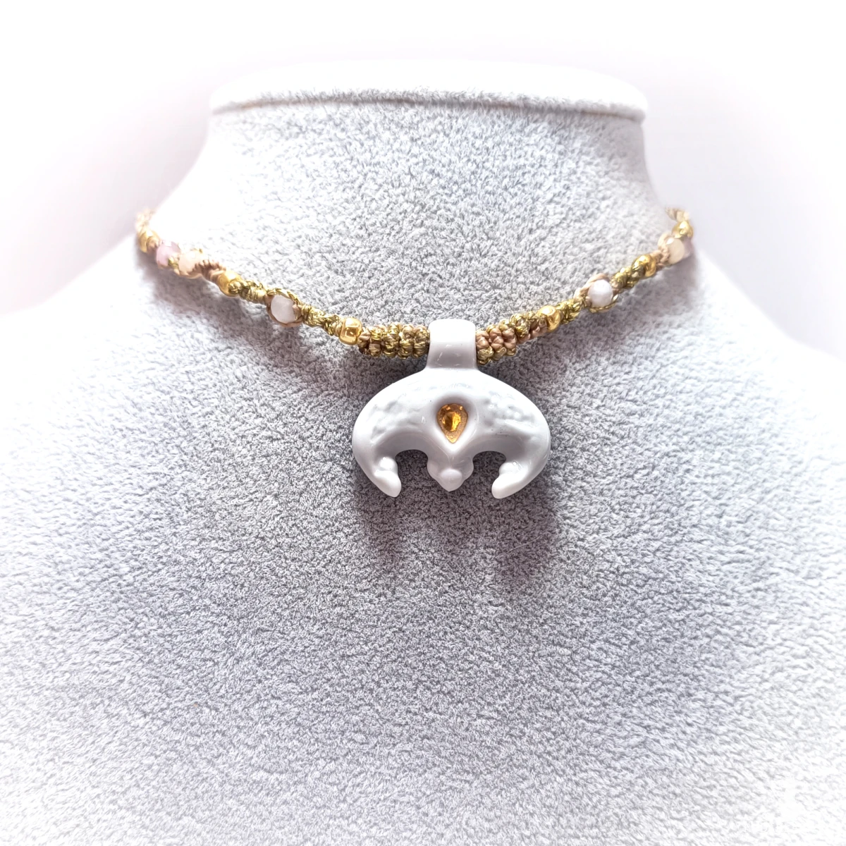 Lunula wykonana jest z porcelany, ozdobiona błyszczącym szkliwem i złotem. Oprawiona techniką mikromakramy, wykonaną ze sznurka o doskonałej jakości.