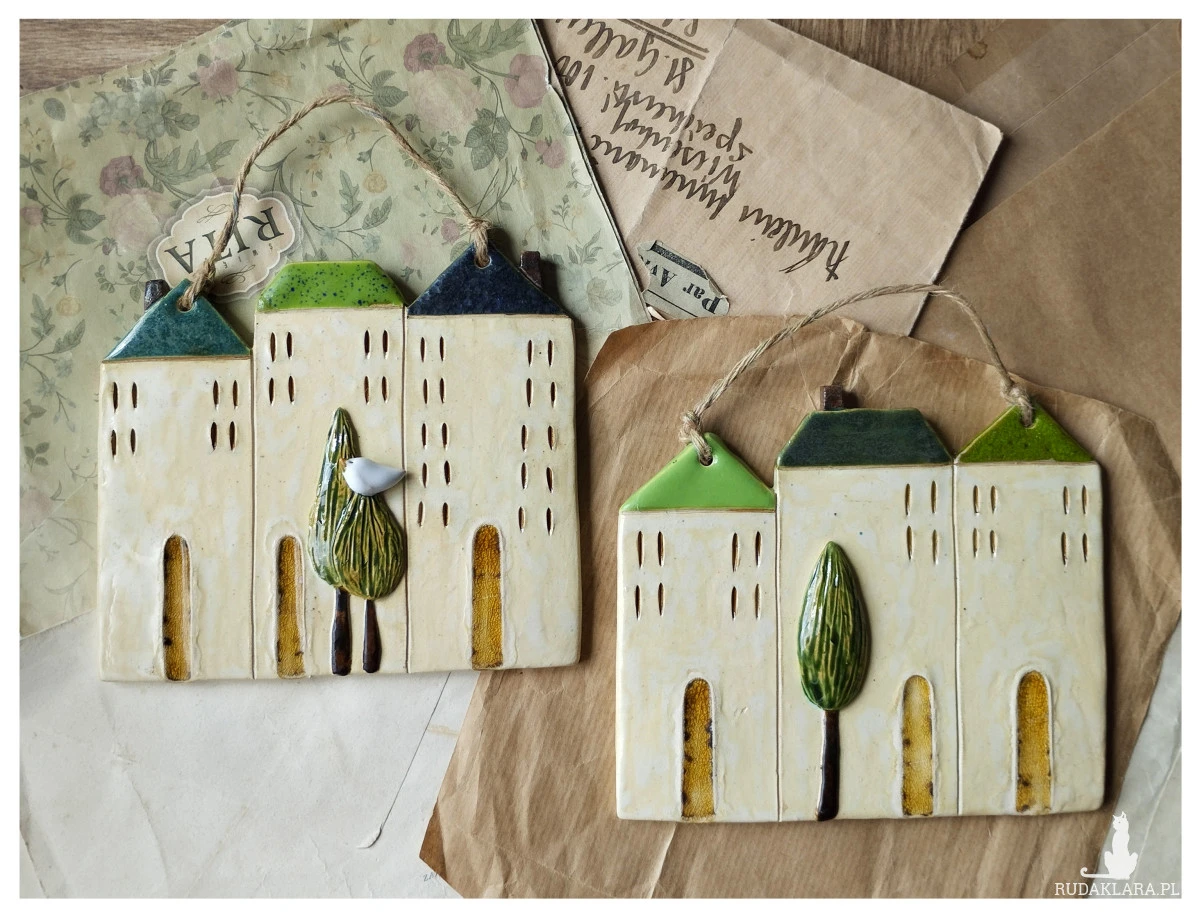 Zestaw 2 ceramicznych kamienic do powieszenia na ścianie, wykonanych z gliny szamotowej wypalonych na biskwit, a następnie szkliwionych w temperaturze ok 1260 stopni C. W starym stylu. Wymiary ok: 15 cm x 14,5 cm. Serdecznie polecam do ozdoby domu lub upominek dla architekta lub osoby pracującej w nieruchomościach :)Kamienice również dostępne osobno.