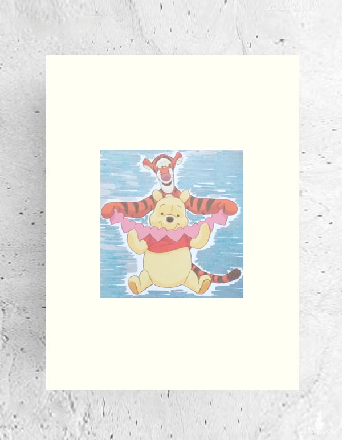 Nowy, kolorowy obrazek z Kubusiem Puchatkiem i Tygrsykiem, lekko srebrzyste tło. Grafika na kremowym kartoniku w rozmiarze A4. Plakat na ścianę do dziecięcego pokoju, kuchni, jadalni, sypialni, żłobka, przedszkola, bawialni, klubu malucha itp. Poster wystarczy dać do ramki w rozmiarze 21 x 30 cm..