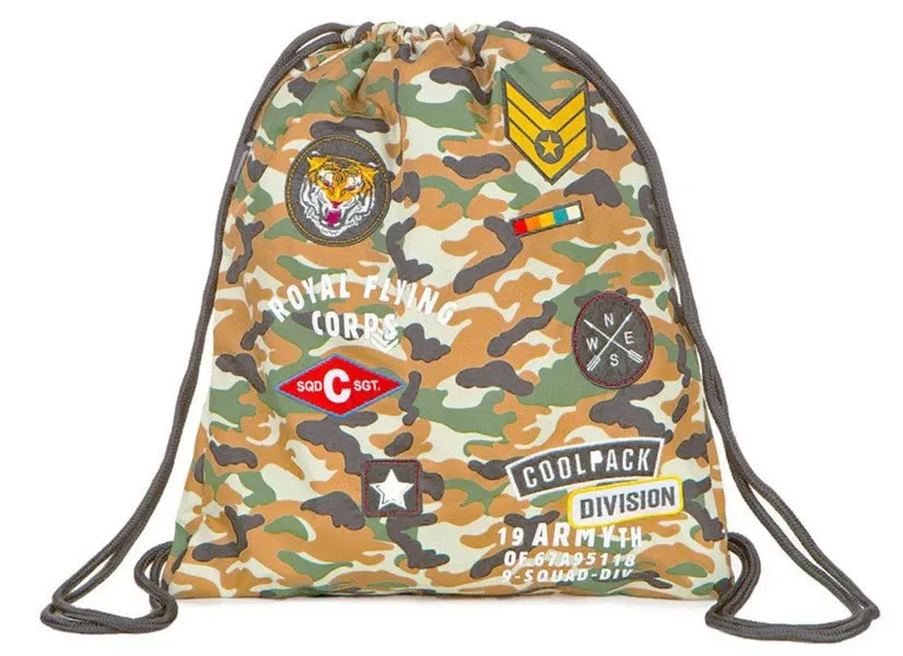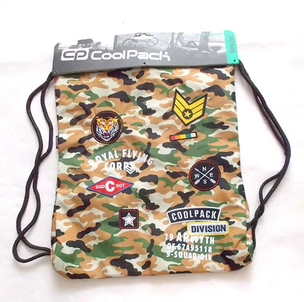 Nowy workoplecak moro z  naszywkami (badges), w militarnym stylu. Wewnątrz podszewka oraz kieszonka zapinana na zamek błyskawiczny. Na zewnątrz zapinany na troczek. Mocny wodoodporny materiał: poliester 100% Marka Coolpack.