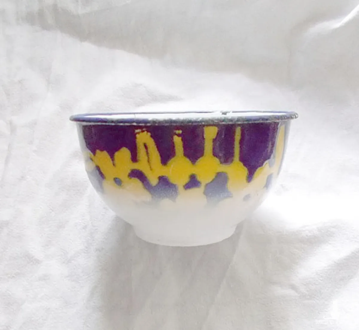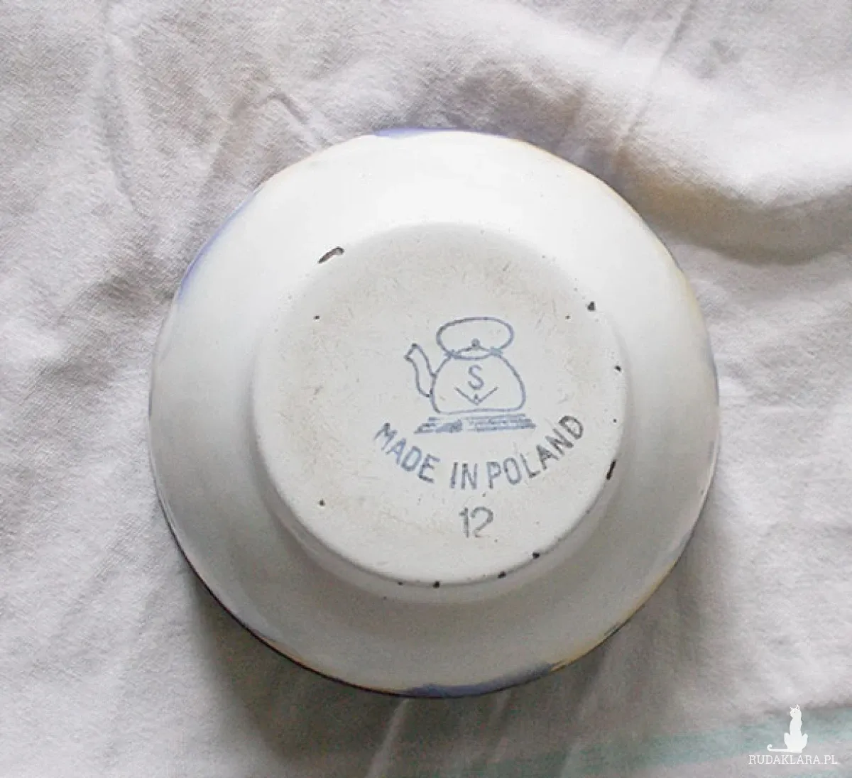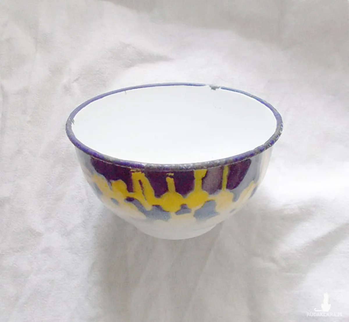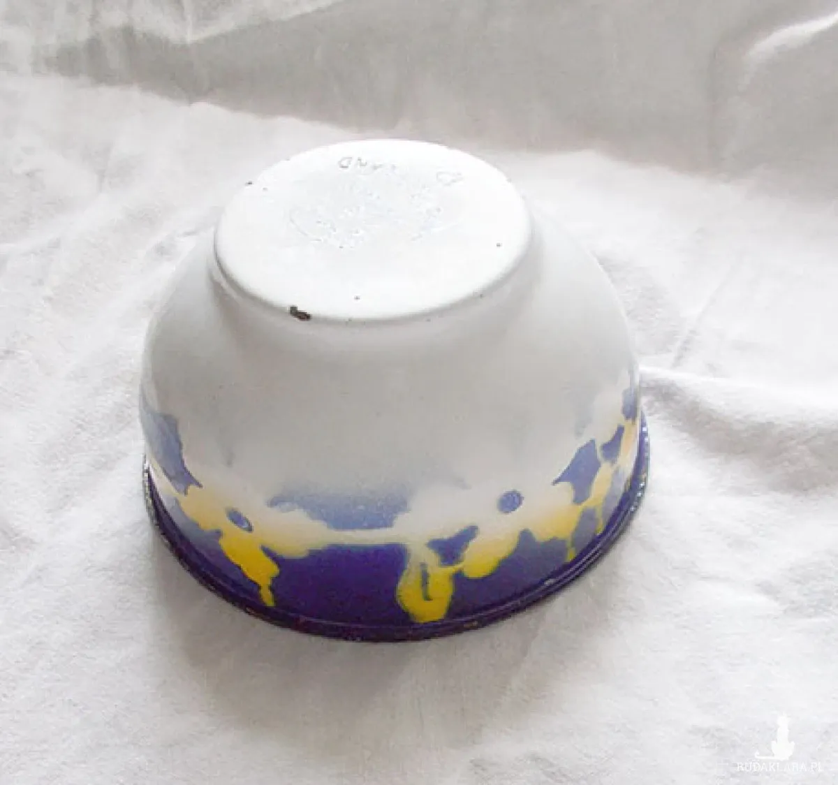 Przedmiot vintage. Emaliowana, metalowa miseczka z okresu PRL, lata 70 XX w. Kolorystyka: granatowy, żółty biały. Posiada ślady upływu czasu i użytkowania (otarcia, trochę rdzy itp.). Lekkie naczynie retro do dekoracji kuchni, jadalni, baru, restauracji itp.