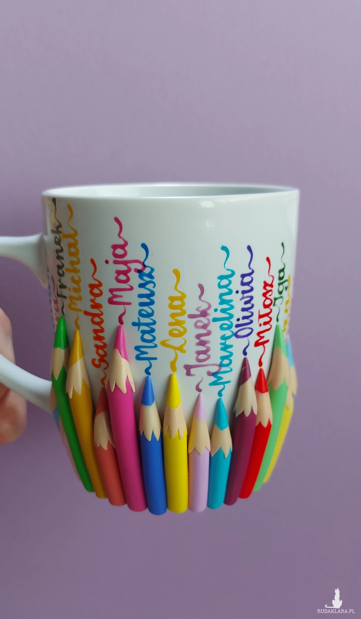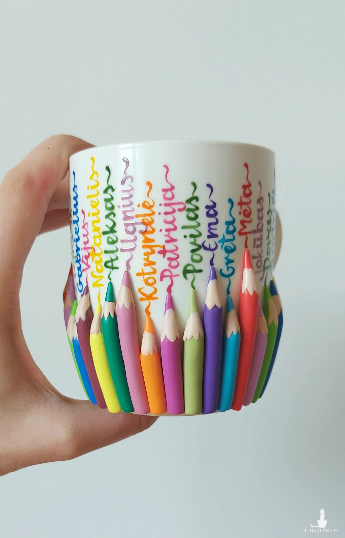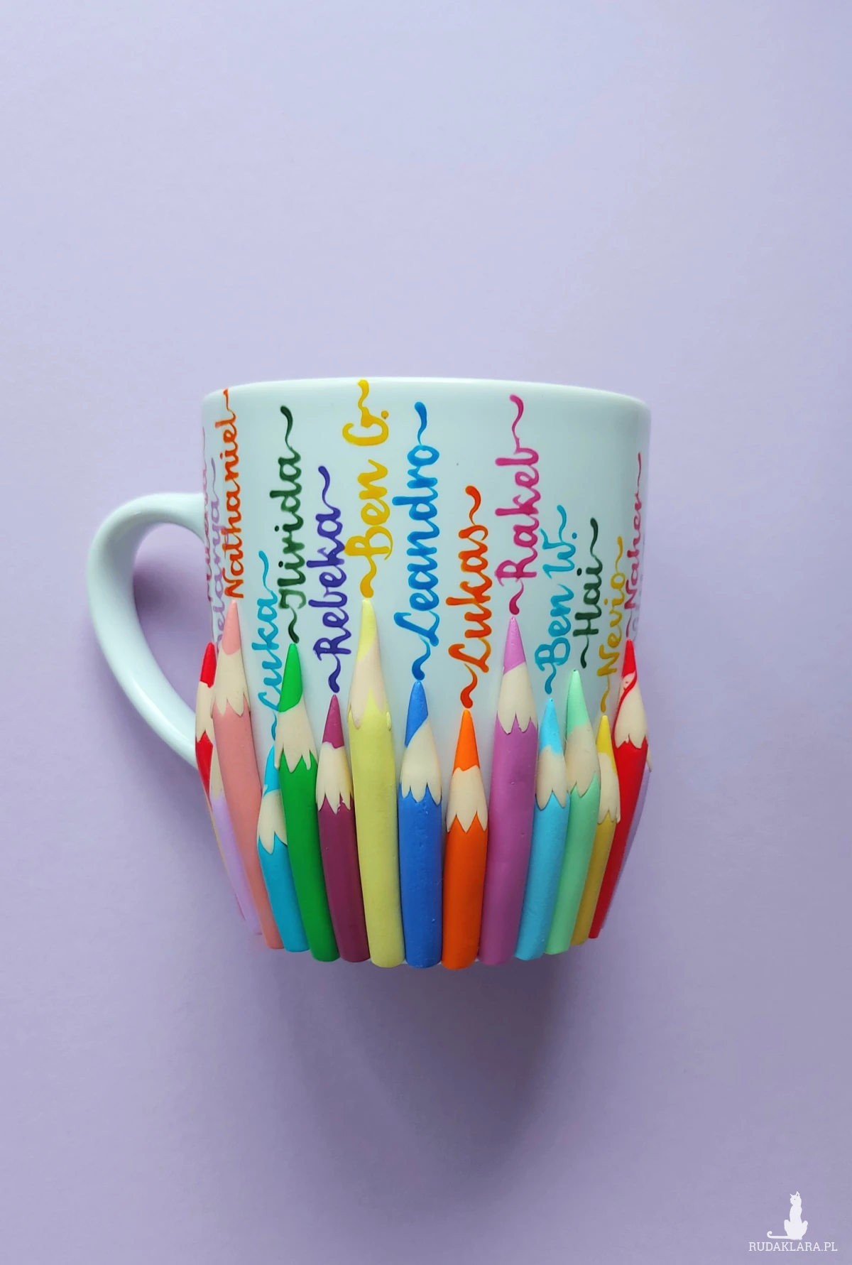 Kubeczek z ozdobą- kredki- wykonaną z gliny polimerowej. Imiona napisane są farbami do ceramiki. Z kubeczka można normalnie korzystać jedynie przestrzegając kilku zasad (do kubeczka dołączam dokładną instrukcję jak najlepiej dbać o kubeczek).