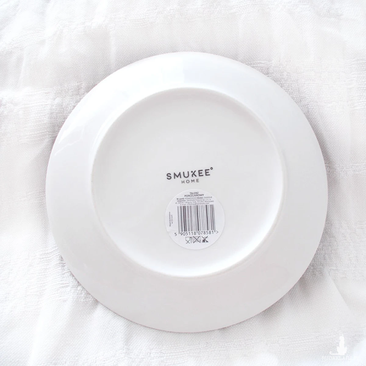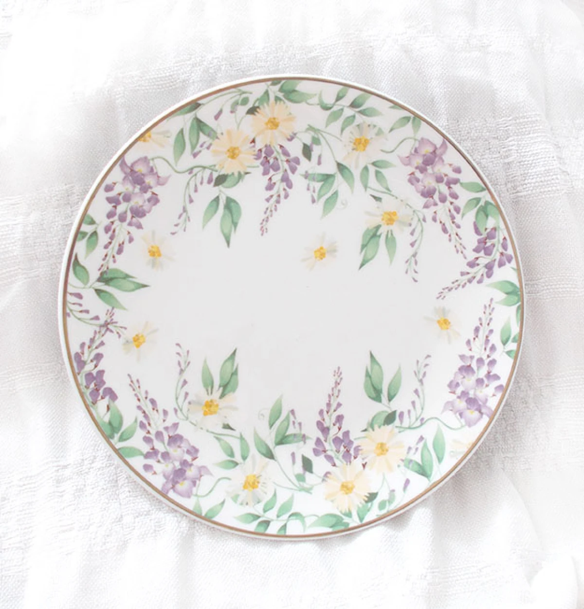 Nowy, deserowy, porcelanowy talerz ze wzorem w kwiatki i obwódką w złotym kolorze. Nie nadaje się do zmywarek ani mikrofalówek, marka "Smukee". Średnica 19 cm. Ładny talerz do użytku na co dzień lub od święta.