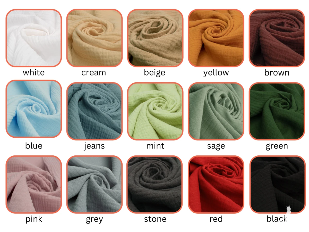 - organiczny muślin (GOTS, OEKO TEX 100)
