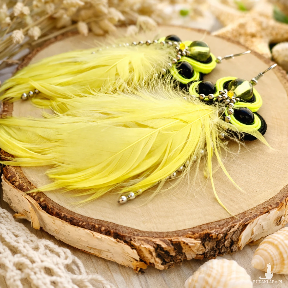 Kolczyki AURELIA to wyjątkowa biżuteria handmade wykonana metodą haftu sutasz. Połączenie delikatnych piór, koralików oraz precyzyjnie ułożonych sznurków soutache tworzy lekką i efektowną formę idealną do stylizacji boho.