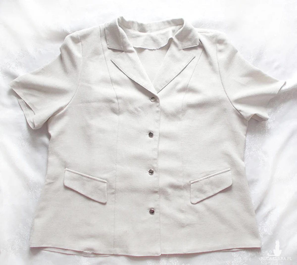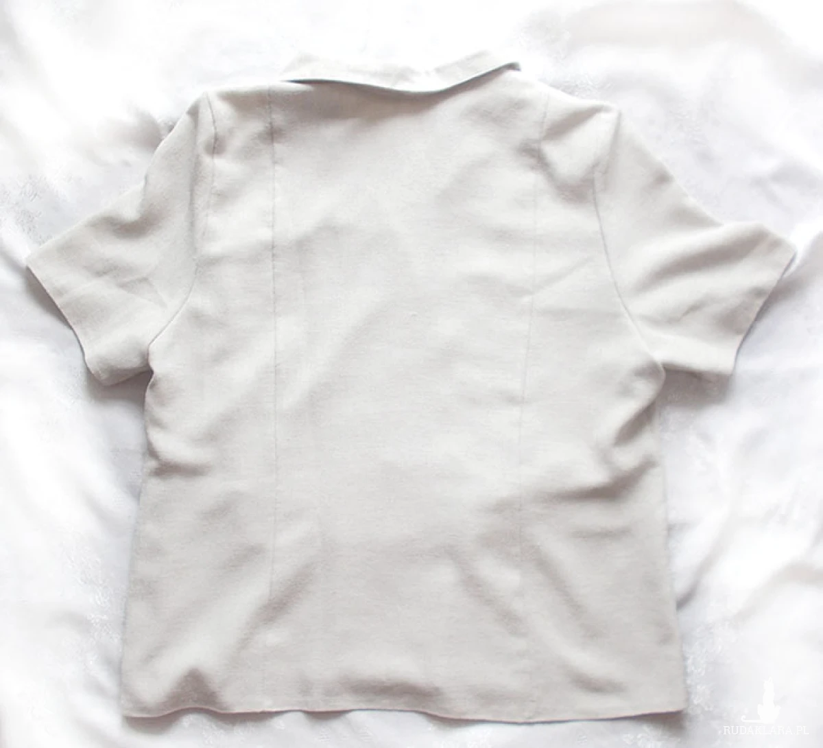 Vintage. Jasna, elegancka bluzka żakietowa z krótkim rękawem, zapinana na guziczki. kolor ecru, kremowy. Wymiary: pacha-pacha: 59 cm, ramiona 41 cm, długość całkowita 62 cm, rękaw 26 cm. Stan bdb.