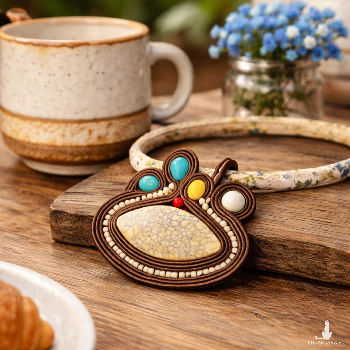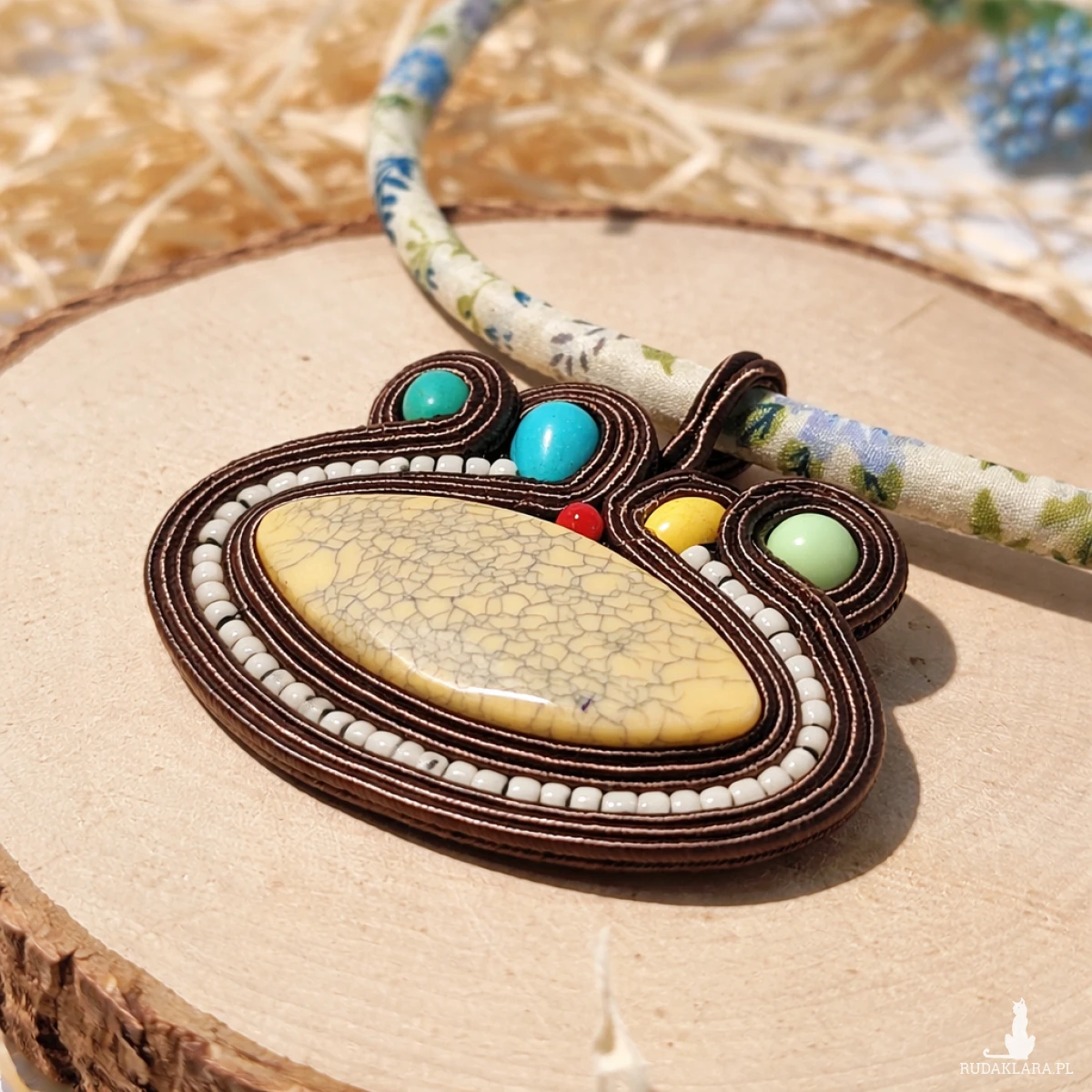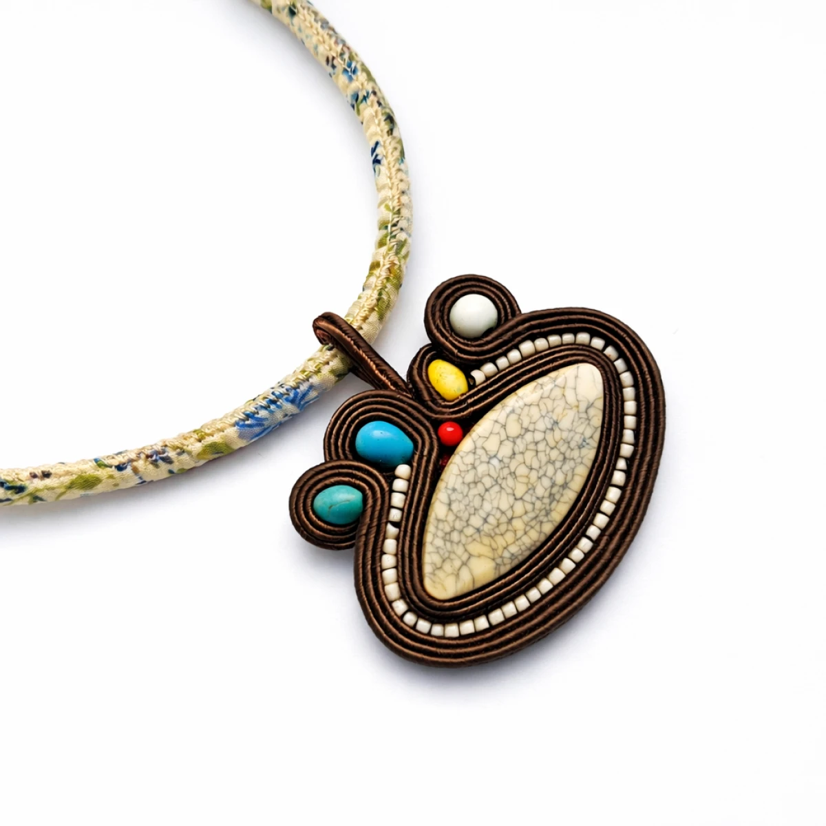Ten wyjątkowy naszyjnik handmade został wykonany techniką soutache (sutasz), łącząc elegancję z naturalnym, artystycznym charakterem. Centralnym elementem biżuterii jest kremowy kamień o subtelnej strukturze, otoczony precyzyjnie ułożonymi sznurkami sutasz oraz drobnymi koralikami.