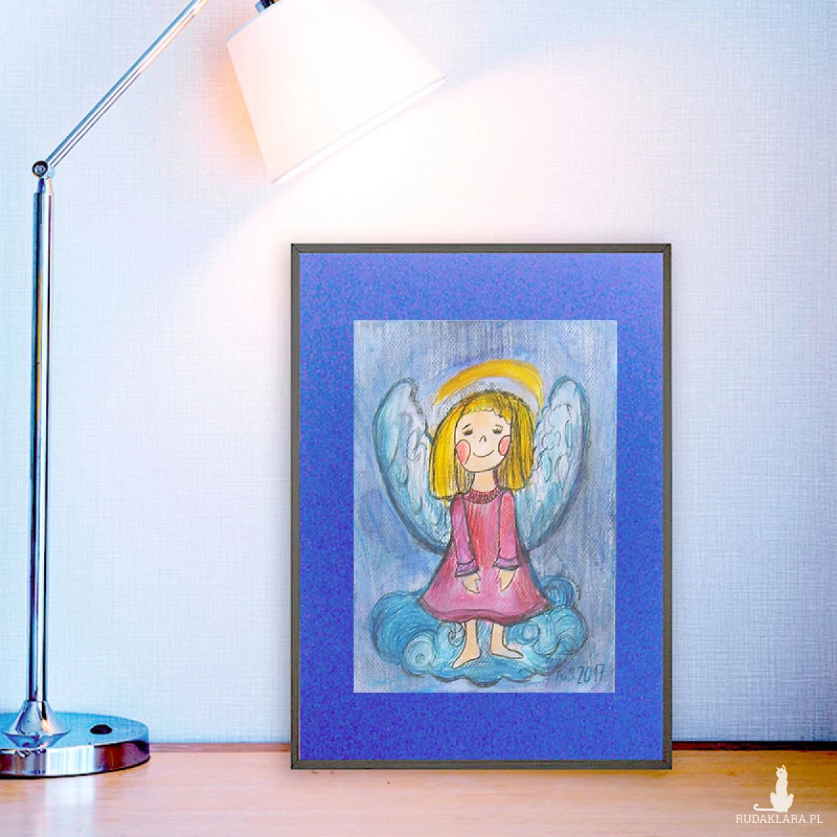 aniołek obrazek A4, akwarela z aniołkiem, aniołek rysunek 21x30, ręcznie malowany obraz z aniołkiem, anioł dekoracja na ścianę