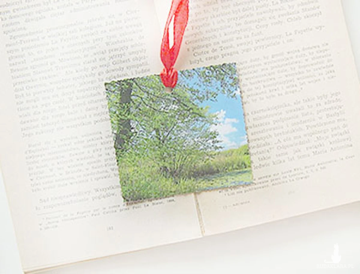 Kolorowa, niewielka, dwustronna zakładka do książki z kwiatami i krajobrazem. Gruby, podwójny kartonik, czerwona wstążeczka.