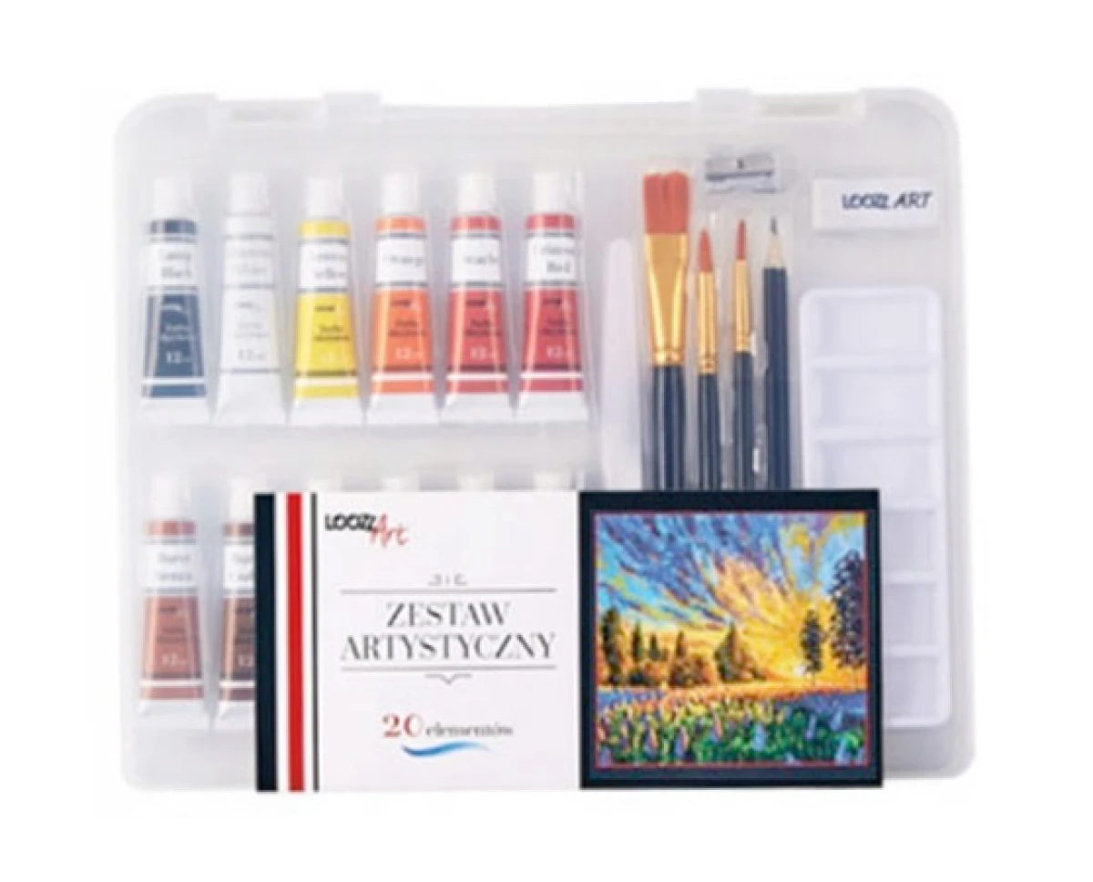 Komplet artystyczny do malowania. W pudełku znajduje się: 12 farb akrylowych w tubkach 12 ml, 3 pędzelki, szpatułka, ołówek HB, paleta do mieszania farb, gumka, temperówka.